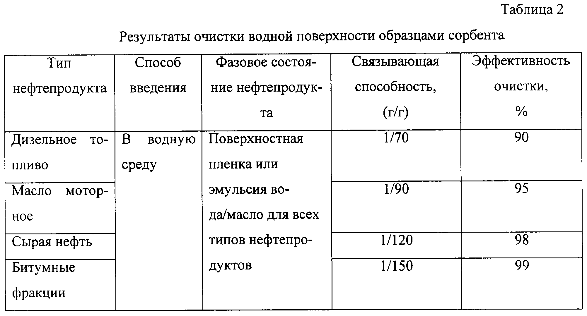 Эффективность очистки определяли по разности массы внесенных и собранных загрязнений. Результаты представлены в таблице 2.