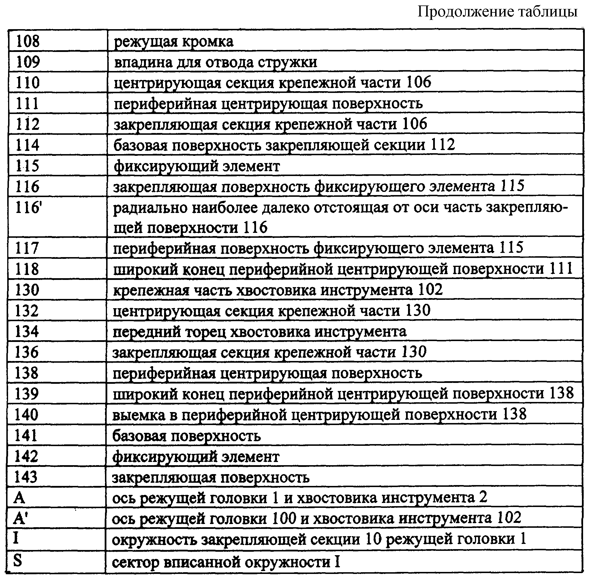 (57) Реферат: Изобретение относится к области обработки материалов резанием, к сборному режущему инструменту, состоящему из сменной режущей головки и хвостовика. Сменная режущая головка для соосного соединения вдоль оси соединения с хвостовиком инструмента с возможностью самозажима имеет режущую часть с, по крайней мере, одной режущей кромкой, расположенной вблизи ее переднего конца, и крепежную часть, расположенную между режущей частью и задним концом режущей головки и включающую центрирующую секцию, имеющую периферийную центрирующую поверхность, расположенную вокруг упомянутой оси и выполненную в основном конической, по крайней мере, на двух ее участках, расположенных с расхождением вдоль указанной оси в направлении к широкому концу периферийной центрирующей поверхности, закрепляющую секцию, имеющую, по крайней мере, две разнесенные друг от друга периферийно расположенные и имеющие протяженность по периферии закрепляющие поверхности, предназначенные для обеспечения осевой опоры режущей головки на хвостовике инструмента. Для повышения надежности соединения каждая закрепляющая поверхность наклонена по отношению к указанной оси с увеличением осевого расстояния от нее до указанного широкого конца периферийной центрирующей поверхности в направлении, в основном соответствующем направлению сил резания, действующих на указанную режущую кромку во время операции резания. При этом закрепляющая или центрирующая секции выполнены с, по крайней мере, двумя периферийно расположенными и разнесенными друг от друга фиксирующими элементами с соответственно указанными закрепляющими поверхностями или указанными участками центрирующей поверхности. 2 с. и 13 з.п. ф-лы, 9 ил., 1 табл. ОБЛАСТЬ ТЕХНИКИ Настоящее изобретение относится к сборному режущему инструменту, содержащему сменную режущую головку и хвостовик инструмента, на котором режущая головка соосно устанавливается и закрепляется с возможностью раскрепления и самозажима. УРОВЕНЬ ТЕХНИКИ Настоящее изобретение в частности относится к сборному режущему инструменту указанного выше типа, используемому в таких операциях обработки резанием, как, например, фрезерование, в которых вращающий момент передается от хвостовика к установленной на нем режущей головке. При проектировании вращающихся режущих инструментов указанного выше типа, имеющих малый диаметр, часто требуется, чтобы режущая головка соединялась с хвостовиком инструмента с возможностью самозажима, что часто достигается путем выполнения на режущей головке и хвостовике инструмента запирающих секций, как показано, например, в Европейской заявке ЕР 0118806. В заявке 0118806 описаны сменная режущая головка и хвостовик инструмента, соединенные соосно и имеющие запирающие секции в виде центрально расположенного и вытянутого вдоль оси выступа в форме ласточкиного хвоста на режущей головке и соответствующей формы выемки на хвостовике. При этом выемка охватывает выступ и они взаимодействуют симметрично относительно оси. Выступ и выемка имеют фиксирующие элементы, которые расположены на периферии так, что при сборке фиксирующие элементы выступа сначала входят между фиксирующими элементами выемки и затем при повороте режущей головки относительно хвостовика переходят в окончательное положение, в котором фиксиру