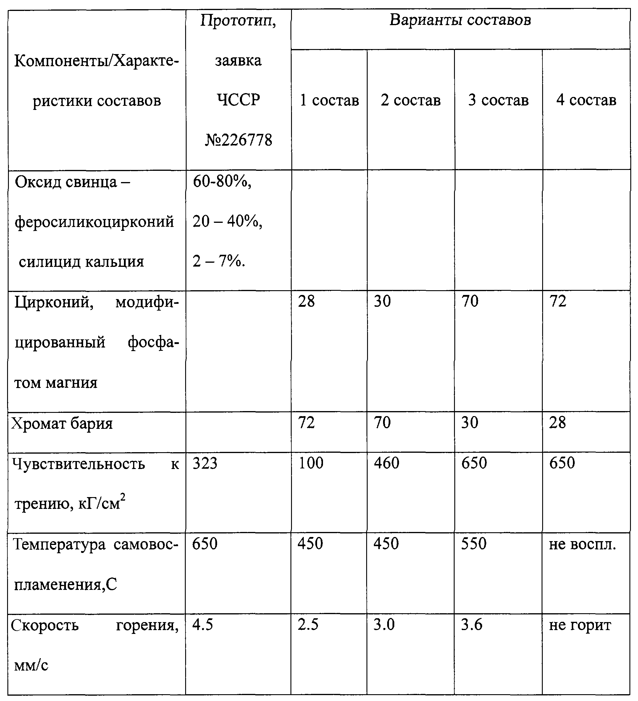 Как видно из данных таблицы чувствительность к трению пиротехнического состава, определяемая по ГОСТу 13803-68, содержащего модифицированный цирконий – 30-70%, хромат бария – 70-30%, снижается с 1 до 6 класса, а по сравнению с прототипом – в два раза. Воспламеняемость (температура самовоспламенения) предлагаемого состава, определяемая по ГОСТу 1040-81, ниже на 100-200 С по сравнению с прототипом, поэтому надежность воспламенения предлагаемого состава выше.