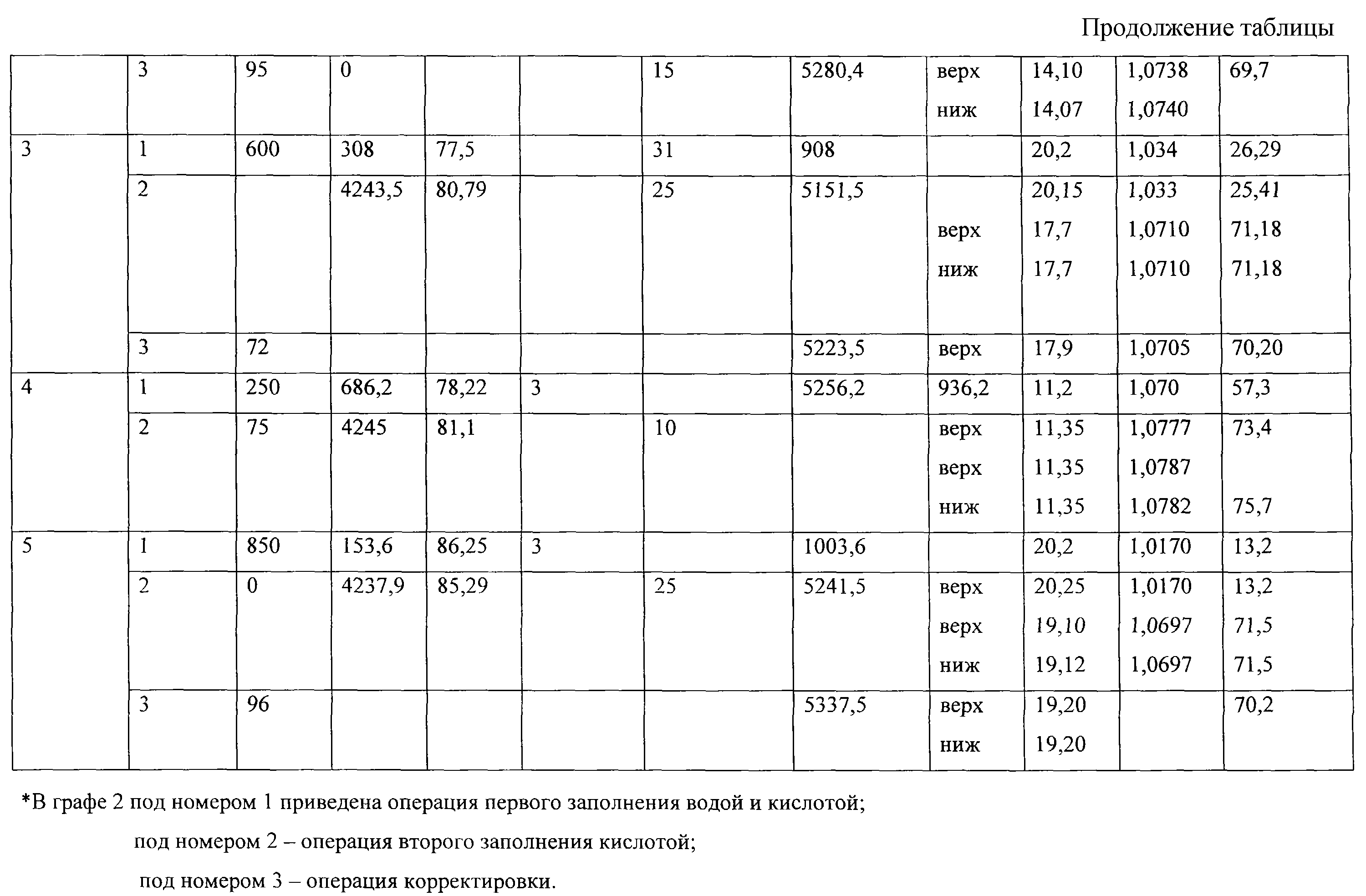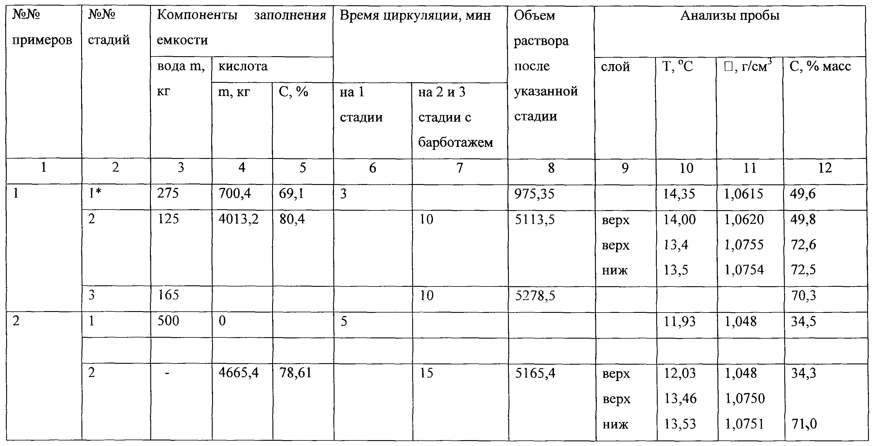 При первом заполнении подают в напорную емкость 2 275 кг воды; 700,4 кг кислоты с массовой долей основного вещества (С) 69,1%, перемешивают путем циркуляции в течение 3 мин и получают 975,4 кг раствора уксусной кислоты с Т=14,35 С, плотностью =1,0615 г/см3 и массовой долей основного вещества С=49,6%, который является водяной подушкой для исходного сырья. При втором заполнении в напорную емкость подают 4013,2 кг уксусной кислоты с массовой долей (С) 80,4%. Анализируют верхний слой: его Т=14,00 С, плотность =1,0620 г/см3 и массовая доля основного вещества (С) 49,8%. Видим, что водяная подушка сохраняется. Проводят перемешивание путем циркуляции с барботажем в течение 10 мин. Снова анализируют верхний и нижний слои. Получают соответственно для верхнего слоя Т=13,4 С, =1,0755 г/см3, С=72,6%, для нижнего слоя Т=13,5 С, =1,0754 г/см3, С=72,5%. Из равенства параметров следует, что гомогенность раствора достигнута. После этого проводят корректировку раствора путем введения 165 кг воды и перемешивания путем циркуляции с барботажем в течение 10 мин. Конечный раствор имеет массовую долю уксусной кислоты 70,26%.