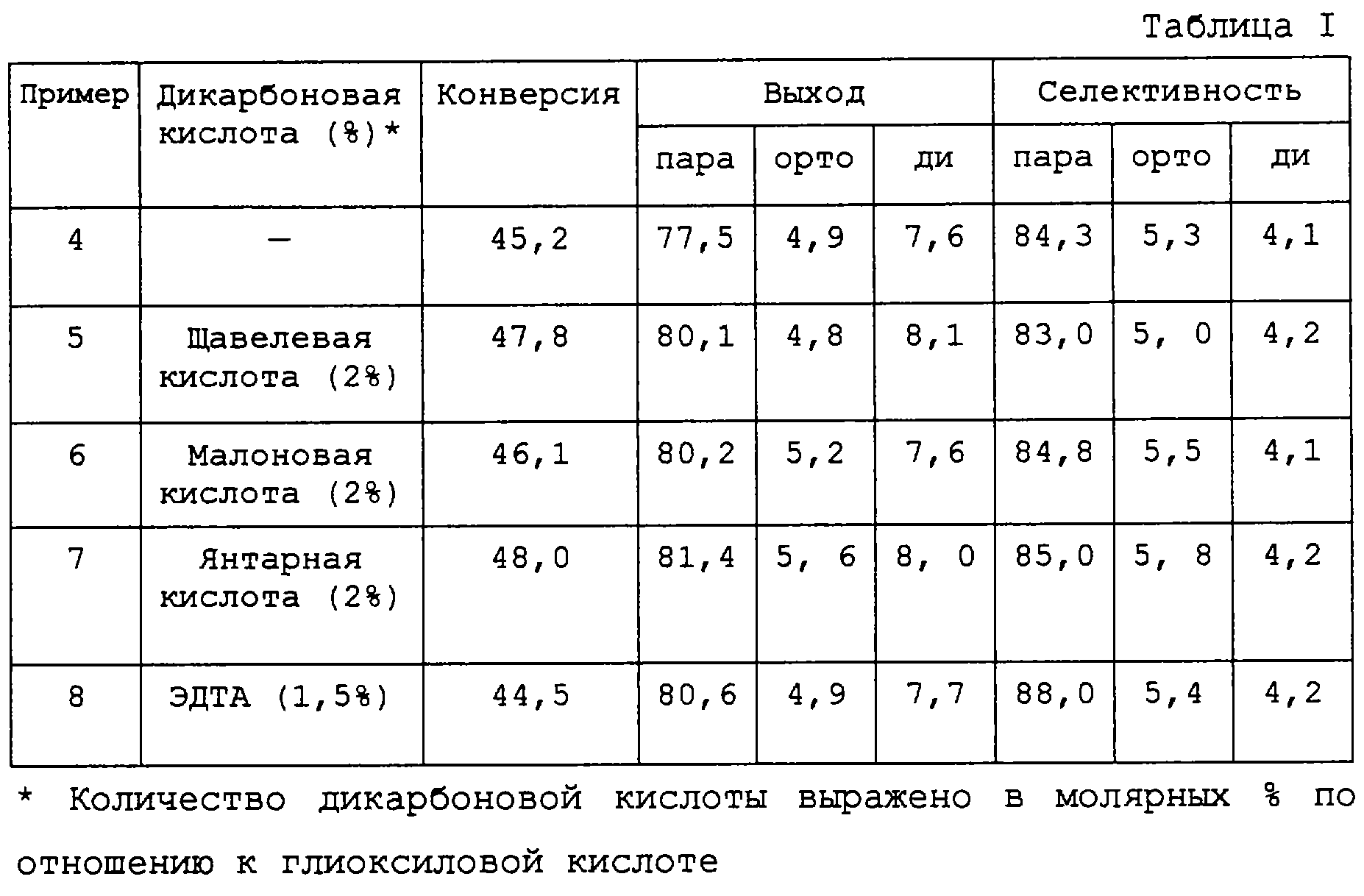 В противоположность этой тенденции, обнаружено, что при получении возможно замещенных п-гидроксиминдальных соединений конденсация глиоксиловой кислоты с соответствующим фенолом осуществляется с более высоким выходом, если реакцию проводить в присутствии определенного количества дикарбоновой кислоты.