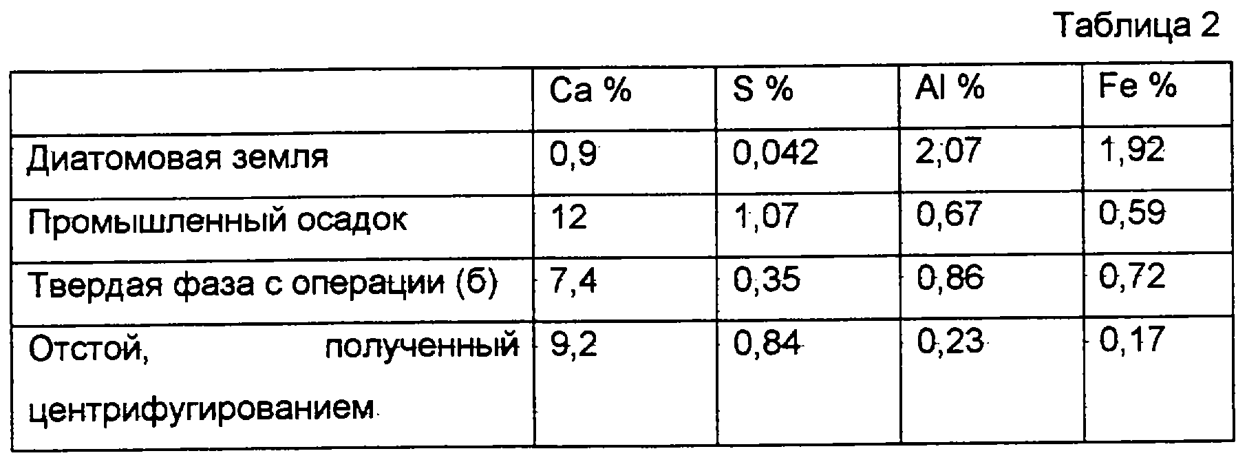 Данные в таблице 2 показывают, что операции (а) и (б) согласно настоящему изобретению позволяют получать после фильтрации твердый материал с содержанием серы в 2,85 раза ниже, чем в исходном промышленном осадке.