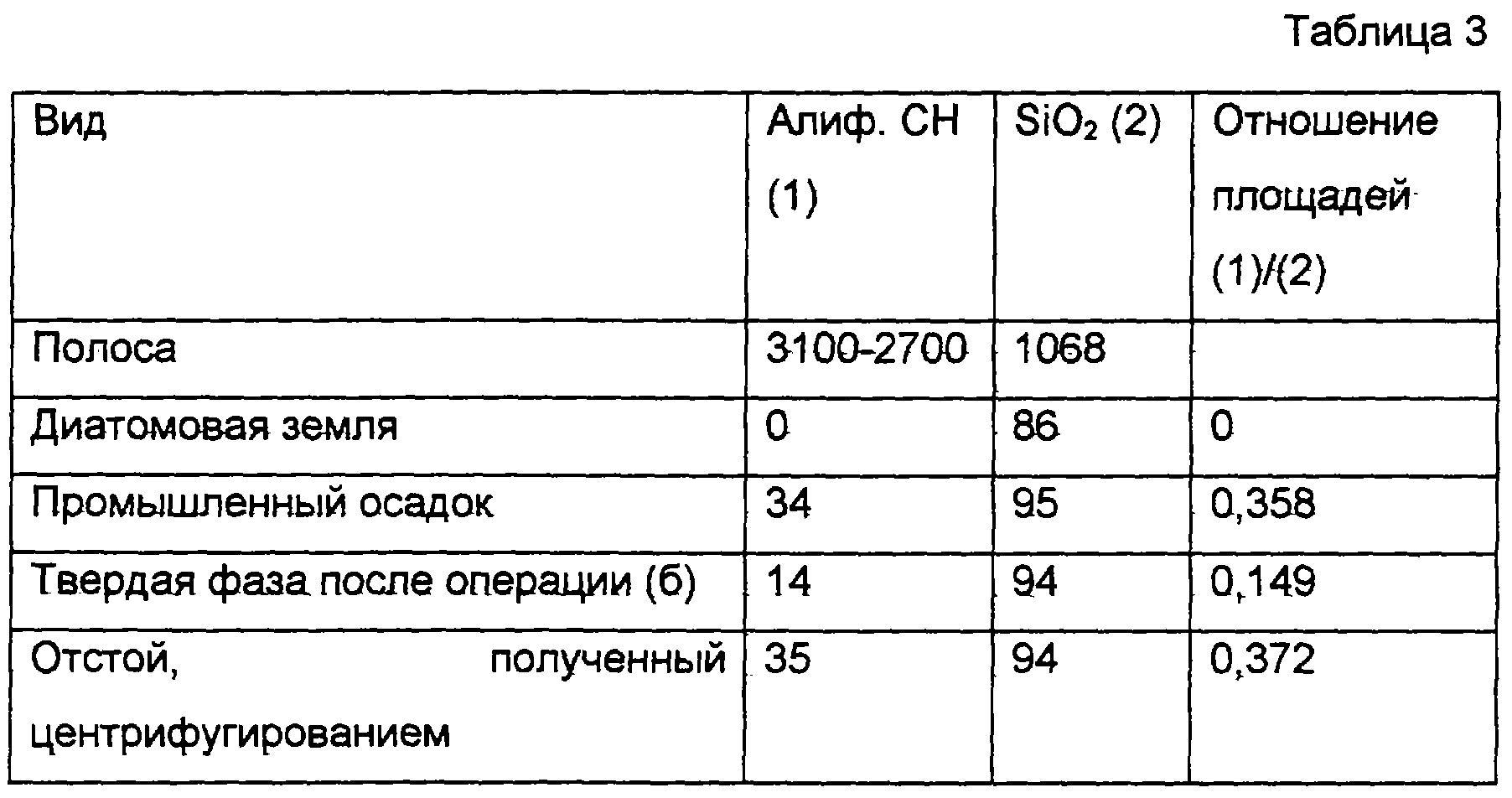 Как можно видеть в таблице 3, обработка промышленного осадка на операциях (а) и (б) способом согласно настоящему изобретению позволяет уменьшать показательное отношение концентрации углеводородов в твердой фазе, извлеченной на операции (б) в 2,4 раза относительно исходного промышленного осадка.