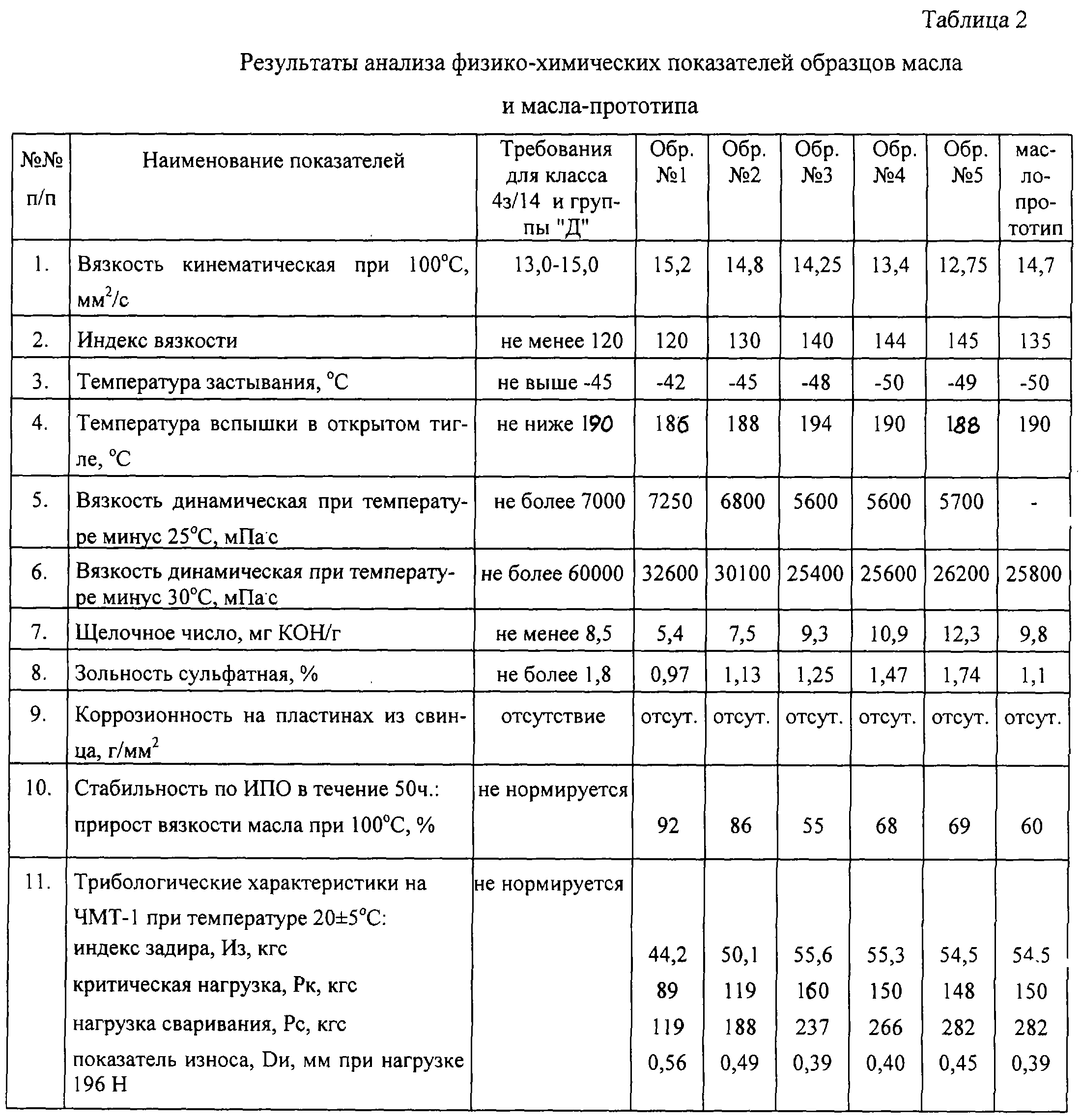 В таблице 2 представлены результаты лабораторных испытаний по оценке физико-химических свойств опытных образцов моторного масла, сопоставленные с соответствующими данными масла-прототипа. Определение физико-химических свойств проводили в соответствии со стандартизированными методиками: вязкость кинематическую при 100°С определяли по ГОСТ 33, индекс вязкости – ГОСТ 24371, температуру застывания – ГОСТ 20287, температуру вспышки в открытом тигле – ГОСТ 4333, вязкость динамическую при температуре минус 25°С – ASTM D 5293, вязкость динамическую при температуре минус 30°С – ASTM D 4684, щелочное число – ГОСТ 11362, зольность сульфатную – ГОСТ 12417, коррозионность – ГОСТ 20502, стабильность по ИПО – ГОСТ 11063, трибологические характеристики на четырехшариковой машине трения – ГОСТ 9490.