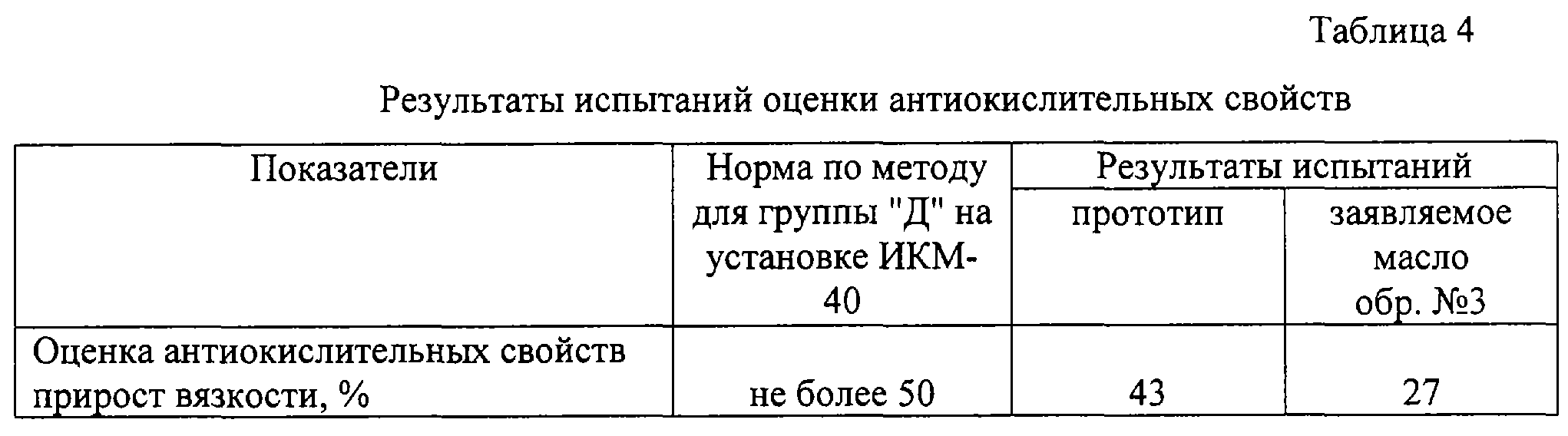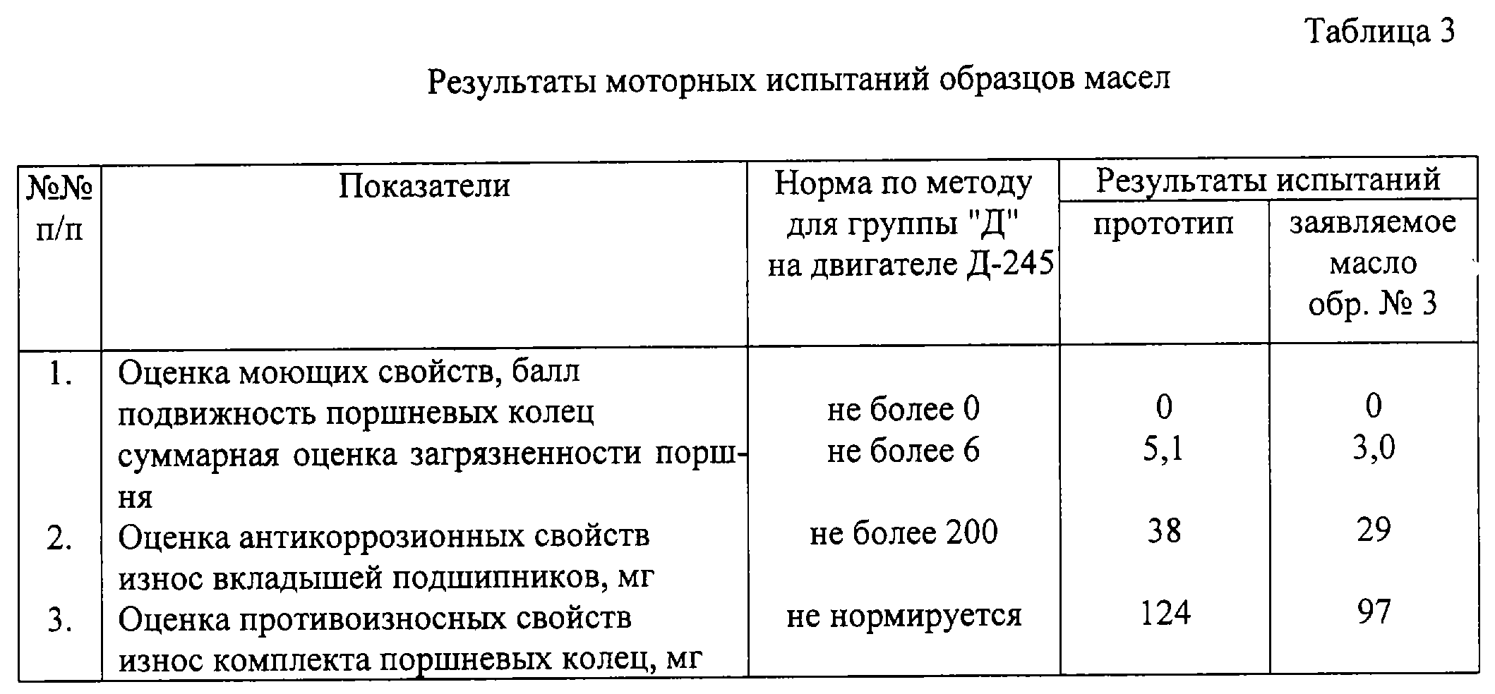 Из результатов лабораторных испытаний видно, что оптимальным по составу и уровню эксплуатационных свойств является образец №3. В таблице 3 представлены результаты моторных испытаний на двигателе Д-245 заявляемого масла (образца №3) и масла-прототипа с целью определения соответствия их требованиям эксплуатационной группы “Д” и оценки противоизносных свойств [ГОСТ 17479.1-85. Обозначение нефтепродуктов. Масла моторные], а в таблице 4 – результаты оценки их антиокислительных свойств на одноцилиндровой моторной установке ИКМ-40 по ГОСТ 20457.