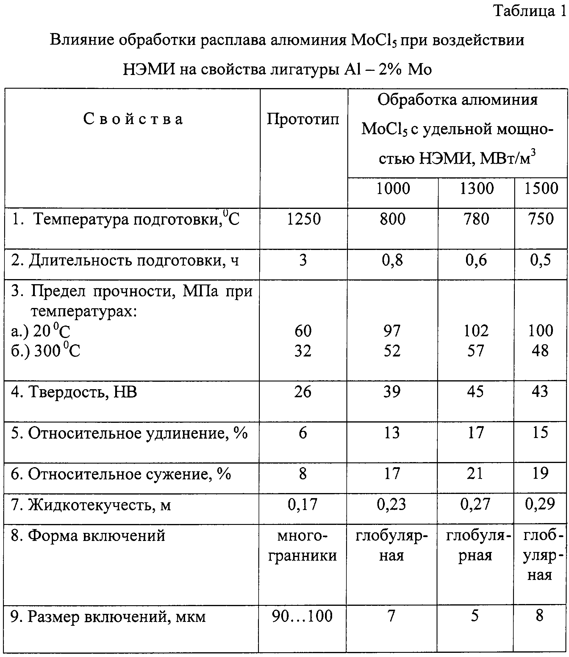 Пример 1. Плавку проводят в шахтной печи типа СШОЛ в стальном тигле, покрытом огнеупорной краской на основе электрокорунда. Расплавляют технический алюминий марки А85 массой 5 кг и перегревают его до 750 С. Температуру контролируют по показаниям платино-платинородиевой термопары, встроенной в печь, и дополнительно хромель-алюмелевой термопарой непосредственно в расплаве. В “колокольчик” помещают в алюминиевой фольге порошок MoCl5 из расчета получения в сплаве 2 мас.% Мо. Опорная часть “колокольчика” представляет собой кварцевую трубку, внутри которой устанавливается латунный стержень, подсоединенный совместно с тиглем к генератору НЭМИ /3/. “Колокольчик” опускают в расплавленный алюминий и осуществляют его обработку MoCl5 при воздействии НЭМИ в течение 20 минут. В ходе испытаний варьируют удельную мощность НЭМИ: 1000; 1300; 1500 Вт/м3.