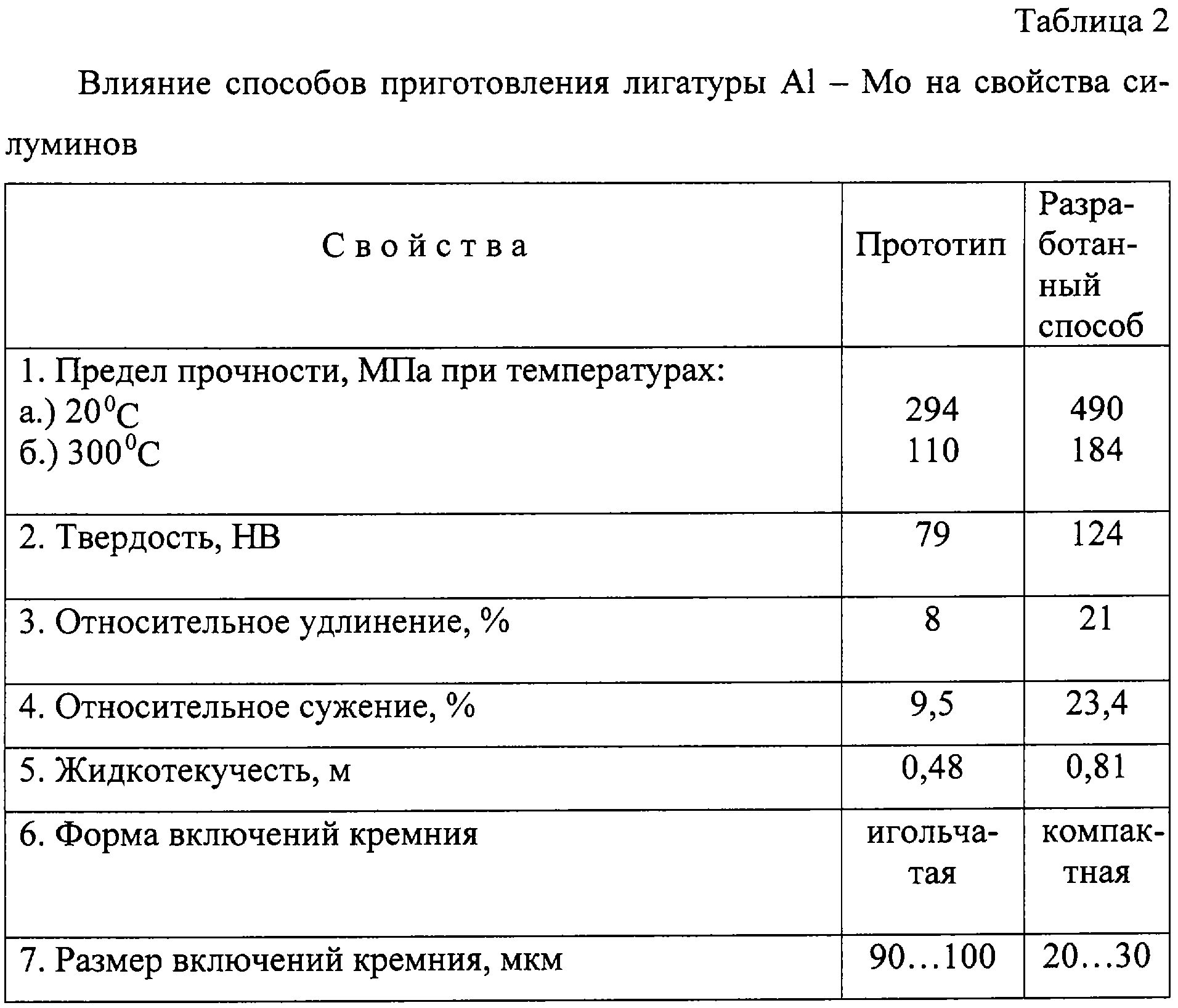 Подготовленные лигатуры применены для выплавки силуминов АК7, дополнительно легированных 0,5…1,0 мас.% Мо. Влияние способов приготовления лигатур Аl – Мо (прототип и разработанный вариант) на свойства силуминов представлено в табл.2. Значения показателей по разработанному способу приведены при обработке расплавленного алюминия хлоридом молибдена с удельной мощностью НЭМИ 1300 МВт/м3.