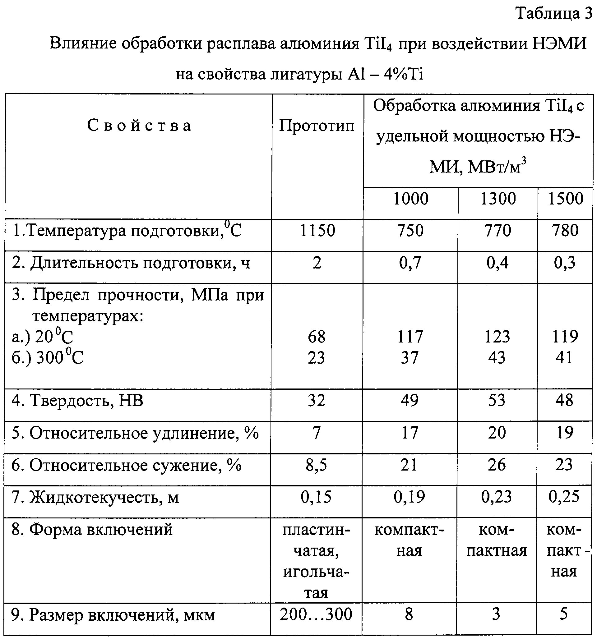 Пример 2. Осуществляют обработку расплавленного алюминия галогенидом титана в виде иодида титана (TiI4) при воздействии НЭМИ. Способ приготовления лигатуры алюминий – тугоплавкий металл в этом случае аналогичен представленному в примере 1, но количество TiI4 дается из расчета получения в сплаве 4 мас.% Ti. В ходе испытаний также варьируют удельную мощность НЭМИ: 1000; 1300; 1500 Вт/м3. Влияние обработки расплава алюминия TiI4 при воздействии НЭМИ на свойства лигатуры Аl – 4% Ti представлено в табл.3. Аналогичные результаты получены при обработке иодидом циркония расплавленного алюминия при воздействии на него НЭМИ с удельной мощностью 1000…1500 Вт/м3.