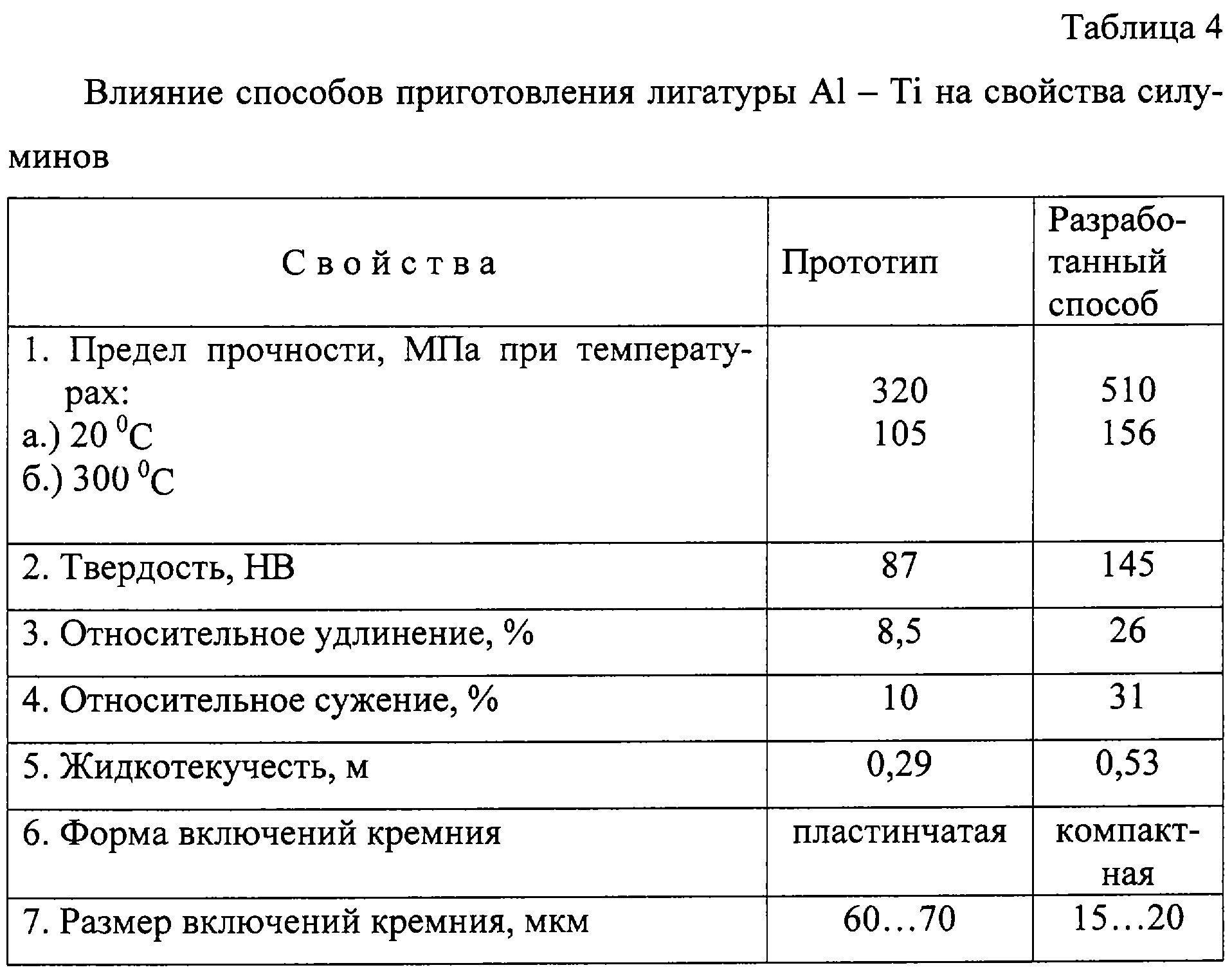 Подготовленные лигатуры применены для выплавки силуминов АК5М (ГОСТ 1583-93), дополнительно легированных 2,5…3,0 мас.% Ti. Влияние разработанного способа приготовления лигатуры Аl – 4% Ti на свойства силуминов по сравнению с прототипом представлено в табл.4.
