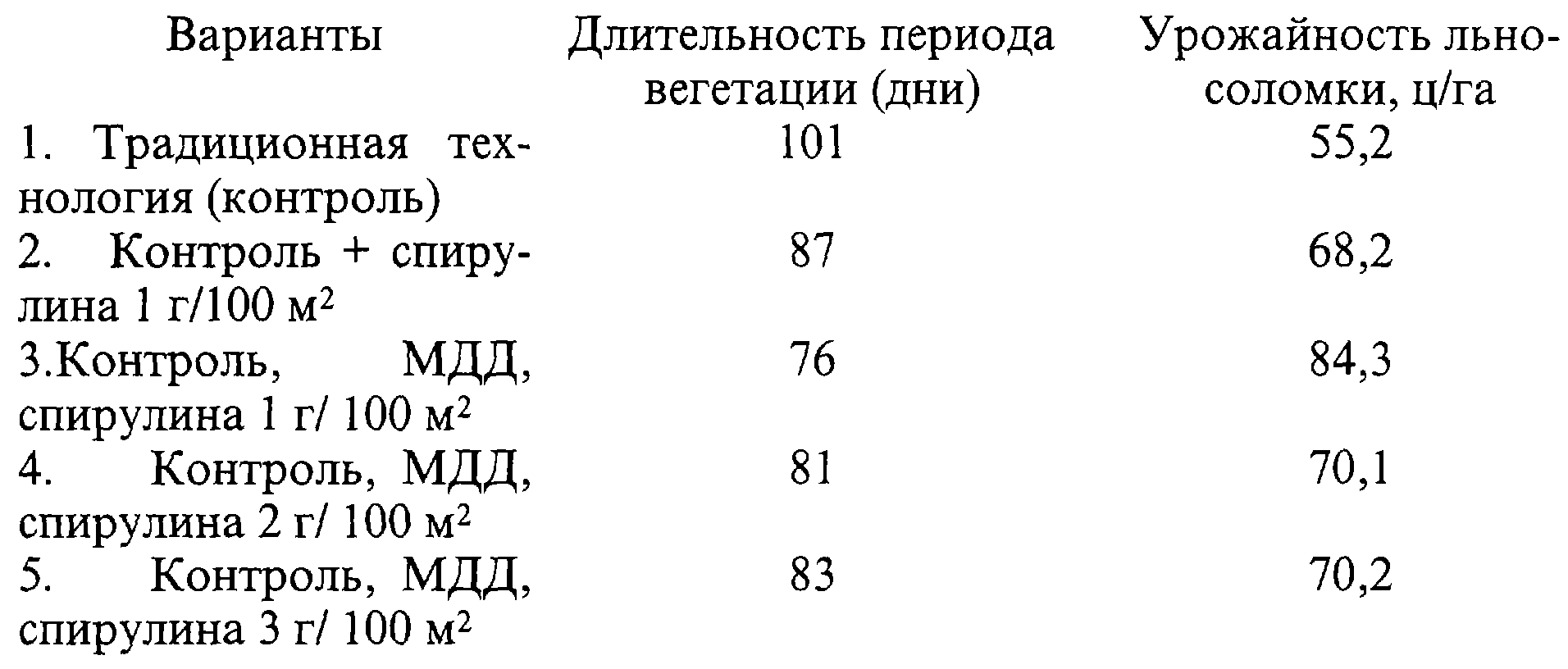 В результате воздействия спирулины в количестве 1 г/100 м2 в виде суспензии в сочетании с ММД нормой 0,8-1,0 м3/га стебель льна-долгунца при сокращении срока вегетации на 10-15 дней достигает 70 см. Сроки уборки сдвигаются на более благоприятное, сухое время начала августа, а урожай и качество льносоломки значительно возрастают.