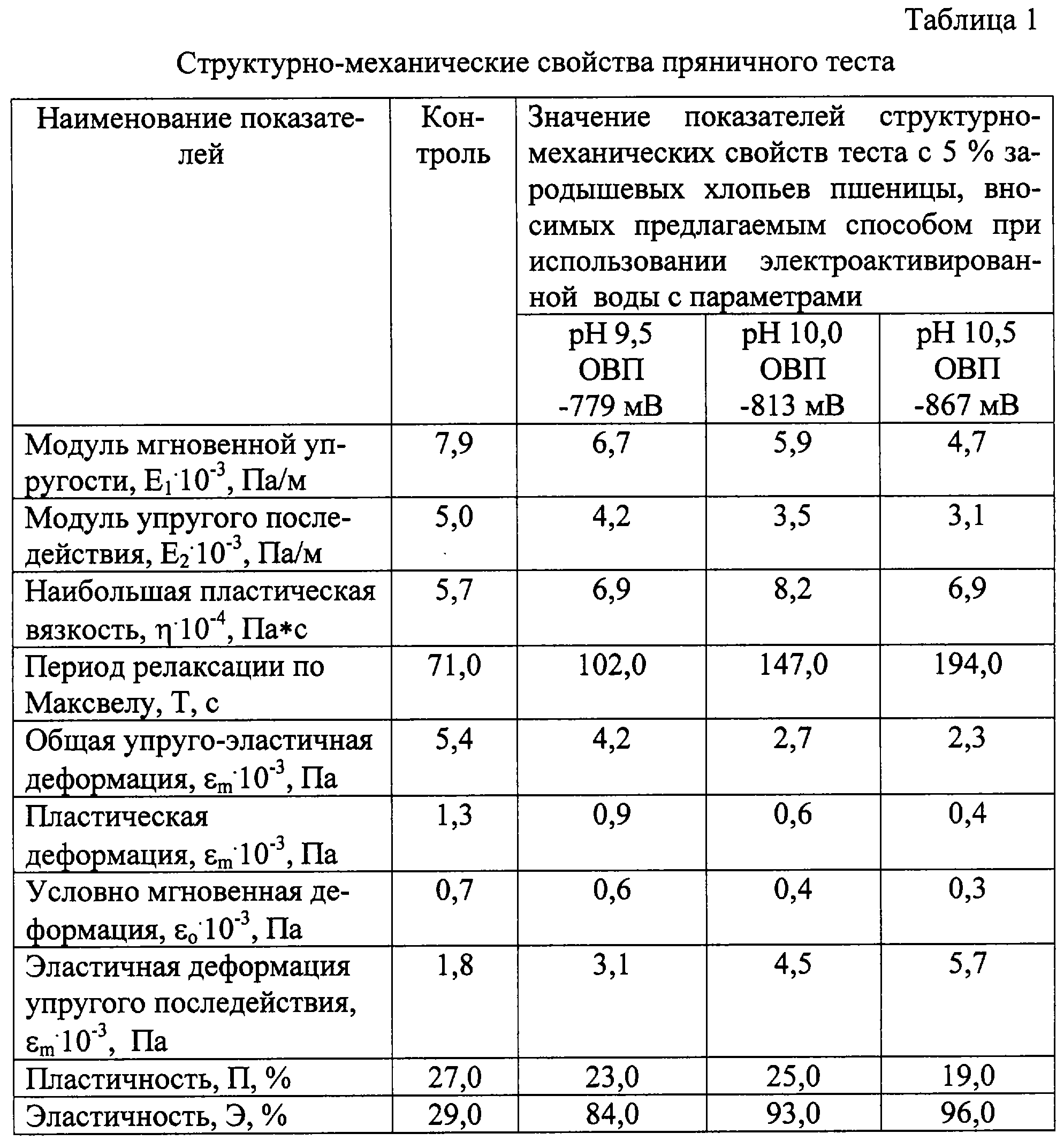 (57) Реферат: Изобретение относится к пищевой промышленности. Способ предусматривает обжарку зародышевых хлопьев пшеницы при температуре 60 С в течение 30 мин. После термической обработки хлопья охлаждают до температуры окружающей среды, затем выдерживают их в течение 25 мин в электроактивированной воде, полученной обработкой постоянным электрическим током при добавлении 0,12% гидрокарбоната натрия до параметров рН 9,5…10,5 и ОВП – 779-867 мВ, готовят эмульсию из сахара, маргарина, меланжа, патоки, масла подсолнечного, вносят в нее набухшие зародышевые хлопья пшеницы, подогревают смесь до температуры 45 С, затем вводят муку, соду, углеаммонийную соль, какао порошок, корицу и замешивают тесто при определенном соотношении компонентов. Затем тесто подвергают формованию и выпечке. Это позволяет улучшить качество готовых изделий, повысить их удельный объем, намокаемость, общую деформацию сжатия, увеличить пищевую ценность и срок годности (хранения) пряников. 2 табл.