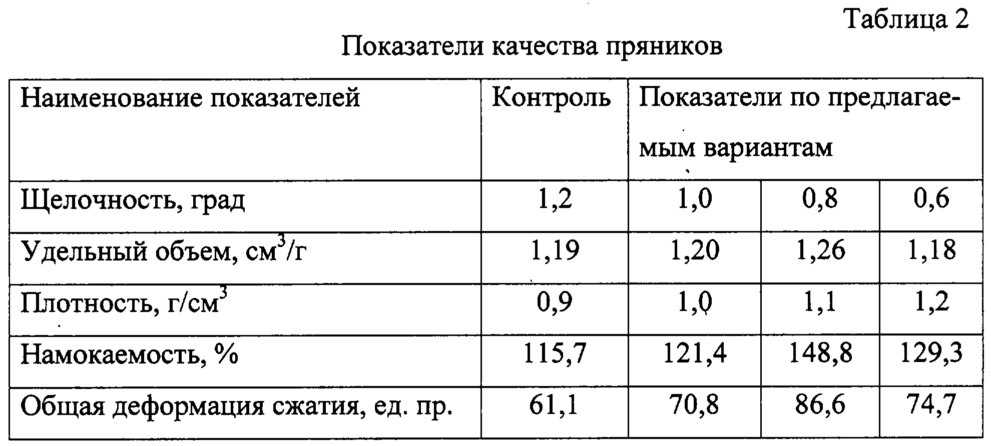 В таблице 2 приведены показатели качества пряников, выпеченных по предлагаемому и контрольному способам.