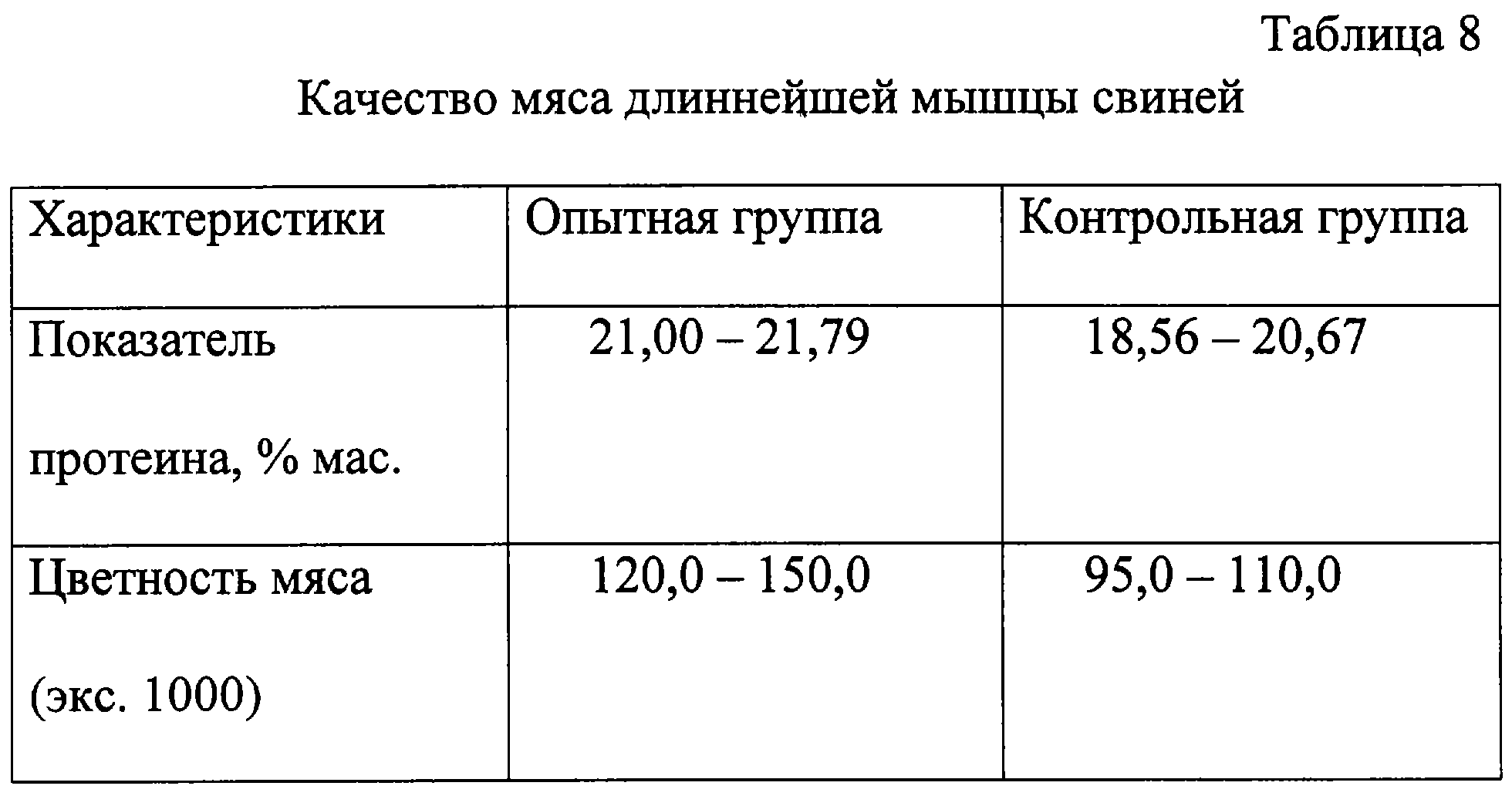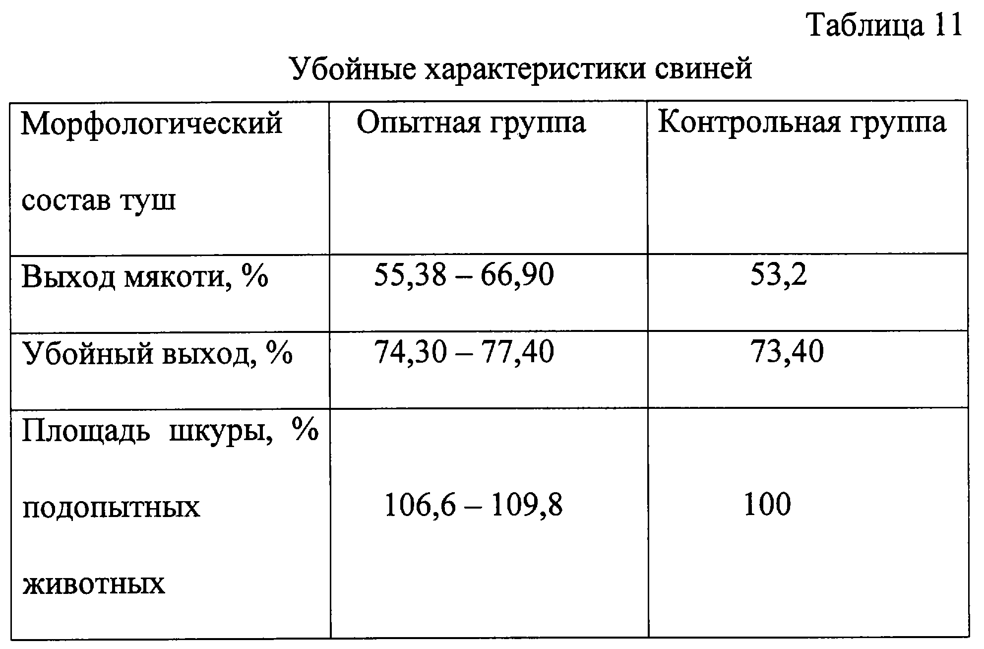 Полученные данные свидетельствуют о том, что выход мякоти при забое свиней, получавших при кормлении препарат, превосходит таковой при содержании животных на обычном рационе. Площадь шкур опытных животных также на 6,6-9,84 больше шкур контрольных животных, что имеет важное практическое значение.