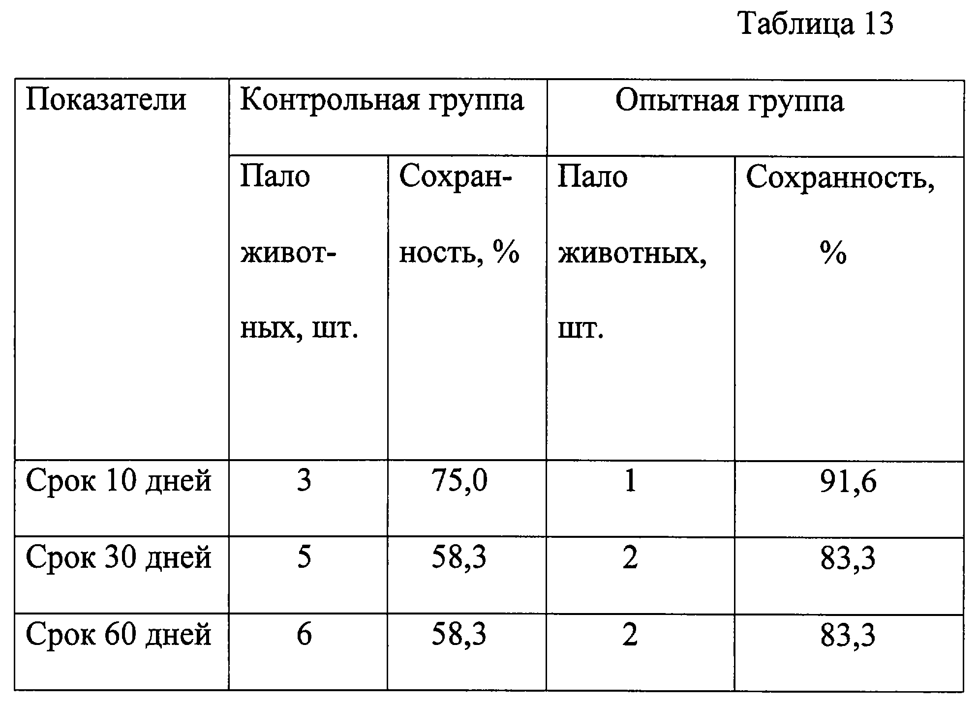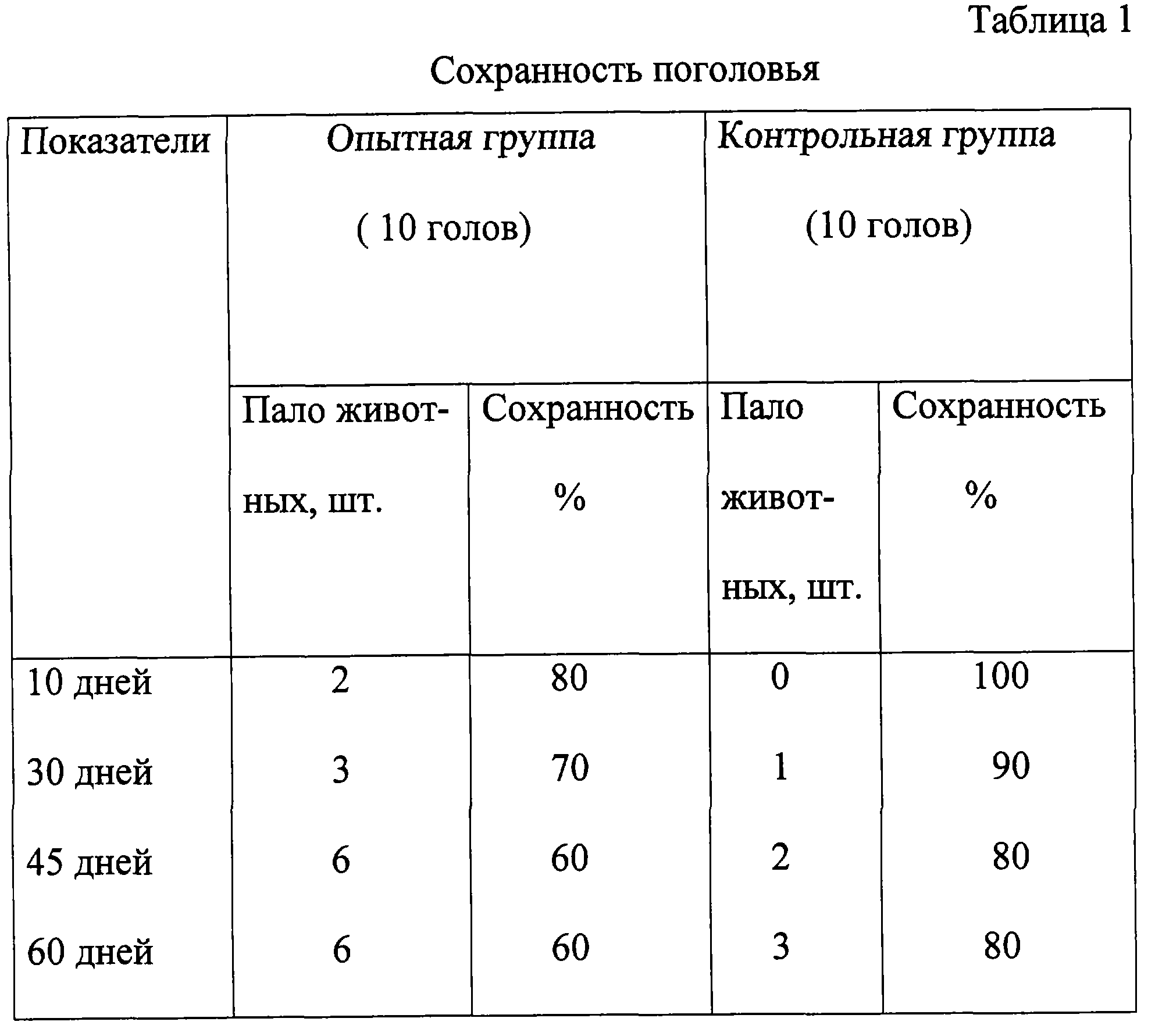 У животных, получавших кормовую добавку, к концу второго месяца нормализовалось клиническое состояние, характеризующееся хорошим аппетитом, активностью. Кроме того, сохранность поголовья в опытной группе на 30% выше, чем в контрольной.
