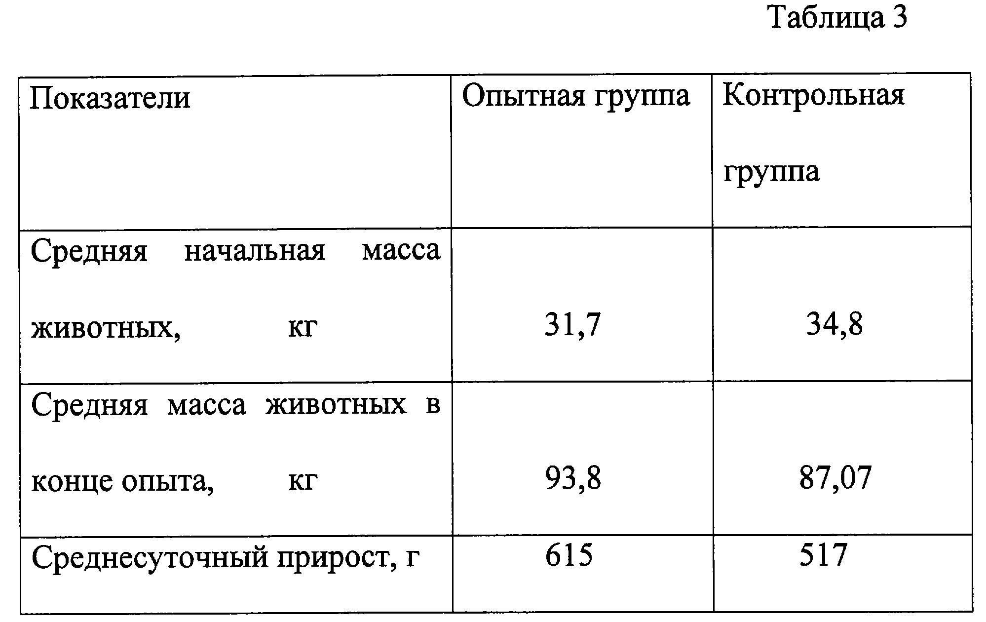 Пример 3. Откорм свиней проводили в государственном унитарном предприятии совхоза “Рощинский” Республики Башкортостан с 8 мая 2001 г. по 17 августа 2001 г. Количество голов в группах – 29. В качестве кормовой добавки использовалась фосфорно-кислая соль 2-амино-4-метилтио-(S-оксо-S-имино)-масляной кислоты и натриевая соль янтарной кислоты в массовом соотношении 1:0,5. Кормовая добавка задавалась с сухим кормом ежедневно в дозе 3 мг/кг массы тела в расчете на фосфорно-кислую соль 2-амино-4-метилтио-(S-оксо-S-имино)-масляной кислоты.