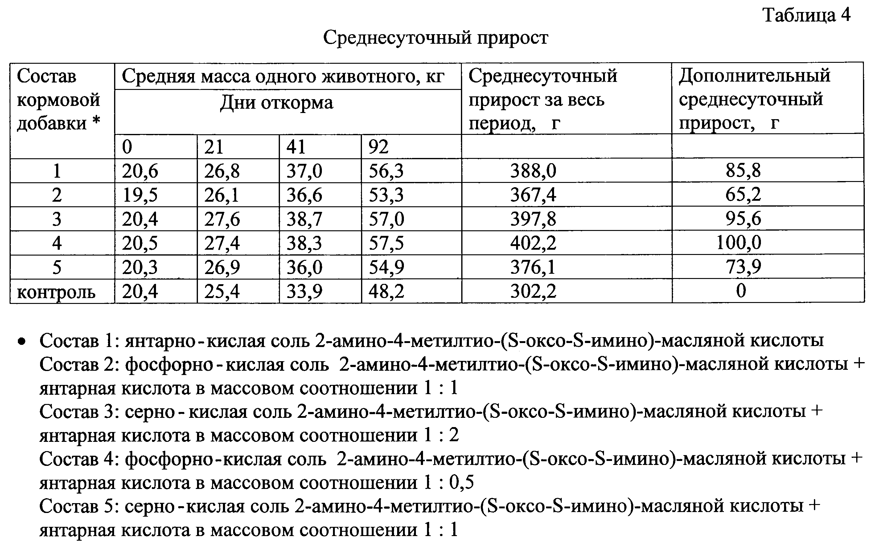 Пример 7. Опыты проводились в Опытном хозяйстве “Уфимское” Республики Башкортостан на свиньях крупной белой породы. Состав кормовой добавки: фосфорно-кислая соль 2-амино-4-метилтио-(S-оксо-S-имино)-масляной кислоты и янтарная кислота в массовом соотношении 1:1 соответственно. Были сформированы 2 группы в количестве по 12 голов в каждой с учетом возраста, живой массы, физиологического состояния поросят. Условия кормления были одинаковыми. Добавку задавали с кормом 1 раз в сутки в течение 180 дней. Дозировка кормовой добавки составляла 3 мг/кг массы тела в расчете на фосфорно-кислую соль 2-амино-4-метилтио-(S-оксо-S-имино)-масляной кислоты.