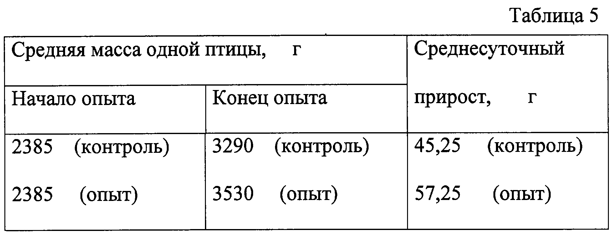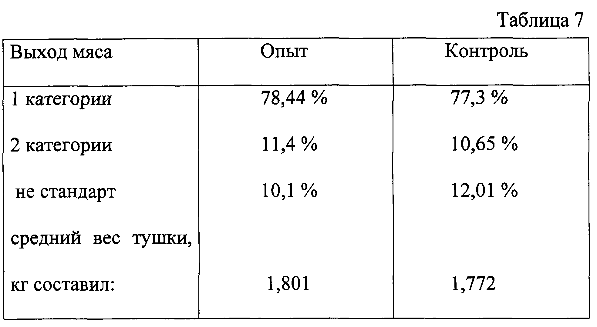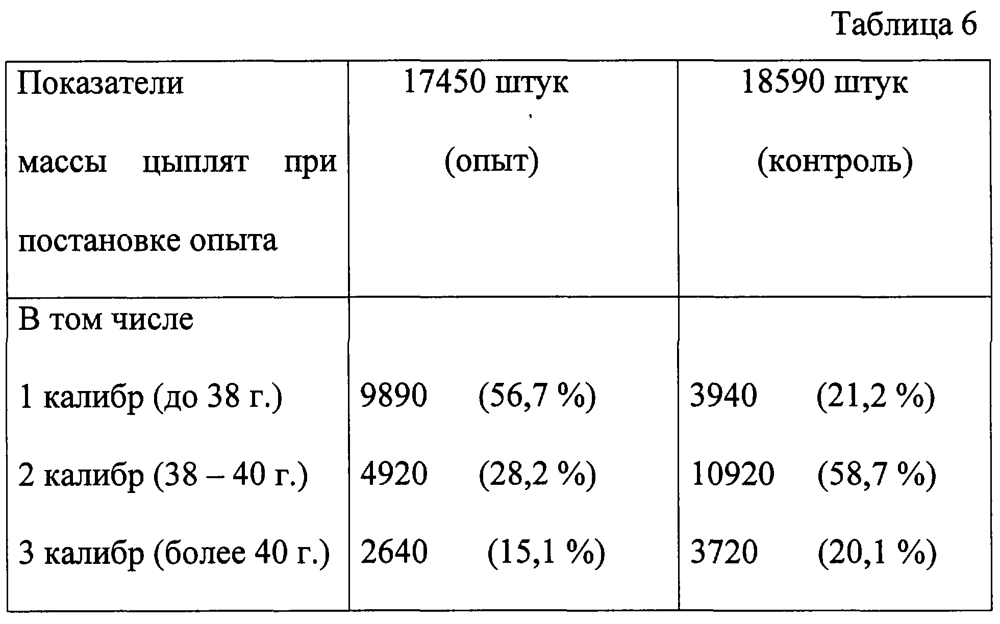 Пример 6. Опыты проводились на Турбаслинской птицефабрике Республики Башкортостан. Янтарно-кислая соль 2-амино-4-метилтио-(S-оксо-S-имино)-масляной кислоты применялась на бройлерах клеточного содержания из расчета 2 мг/кг живой массы ежедневно в течение 42 дней откорма. Сравнение проводили с группой бройлеров, содержащихся в подобных условиях, получавших аналогичных корм, но без препарата. В клетках было заселено (см. табл.6):