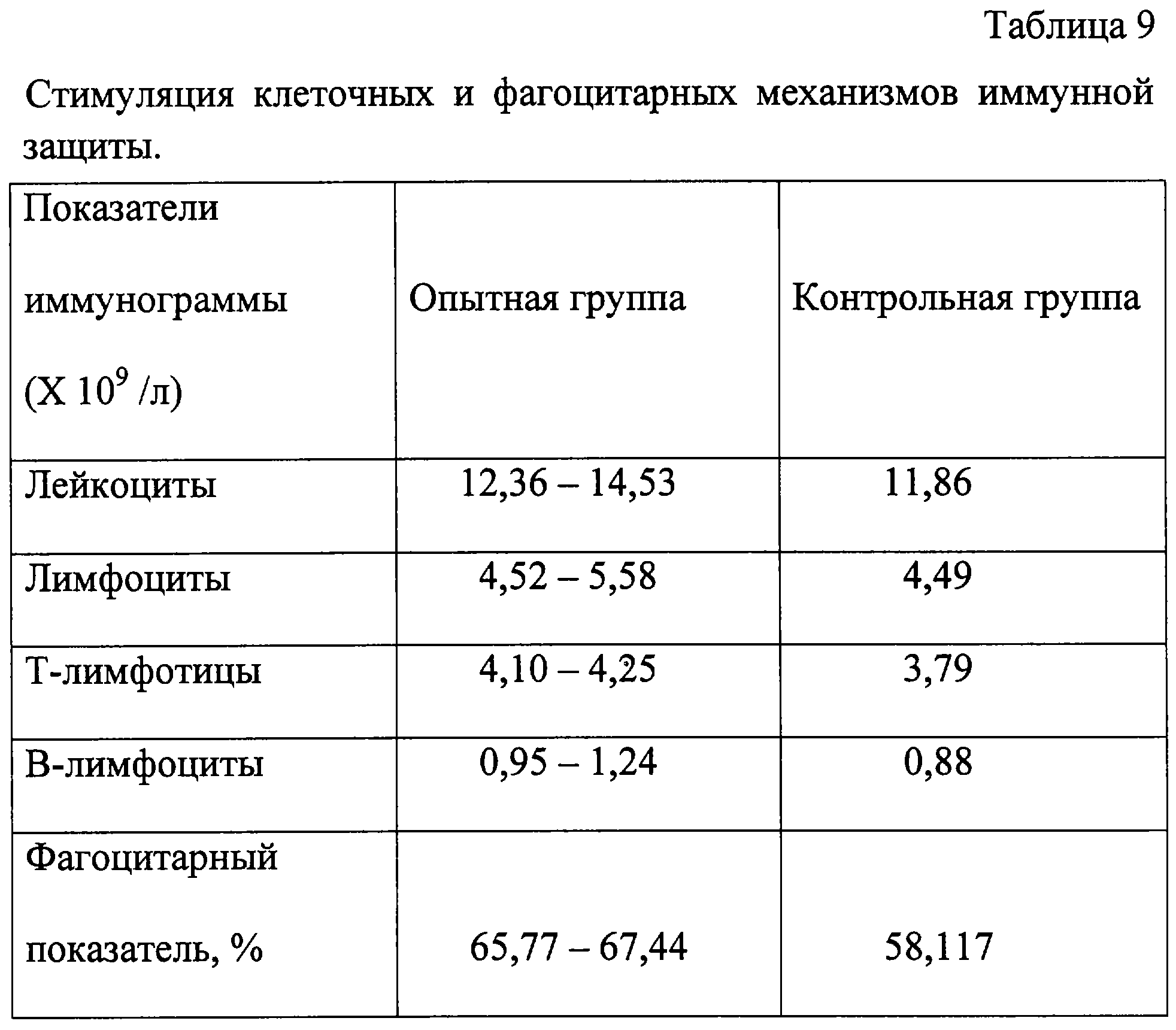 Как следует из представленных данных, кормовая добавка обладает иммуностимулирующим действием, что выражается в существенном увеличении в крови лейкоцитов и в том числе Т- и В-лимфоцитов и в возрастании показателей активности фагоцитов. Таким образом, применение кормовой добавки вызывает устойчивую тендецию к стимуляции клеточных и фагоцитарных механизмов иммунной защиты.