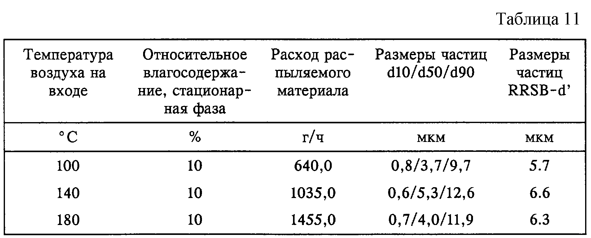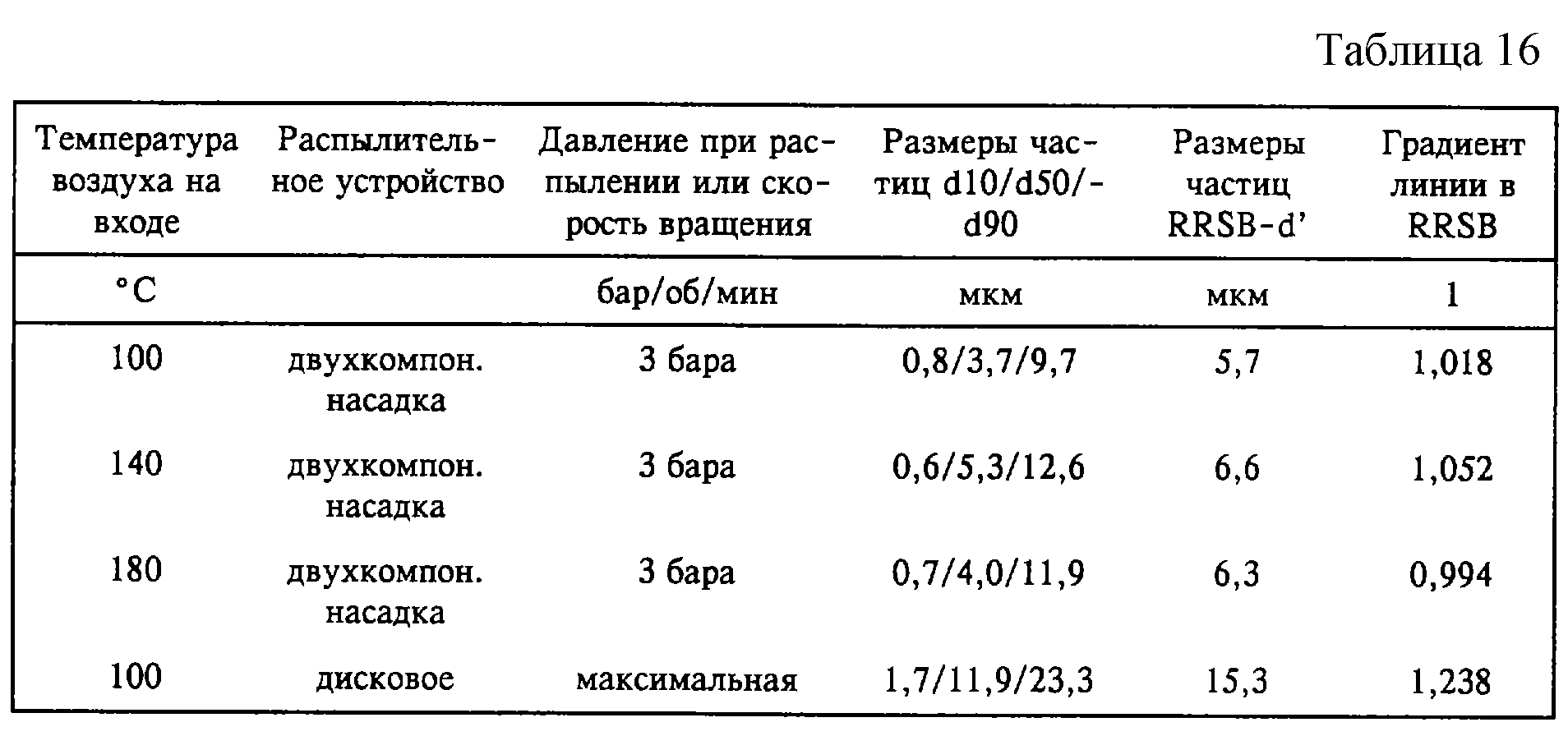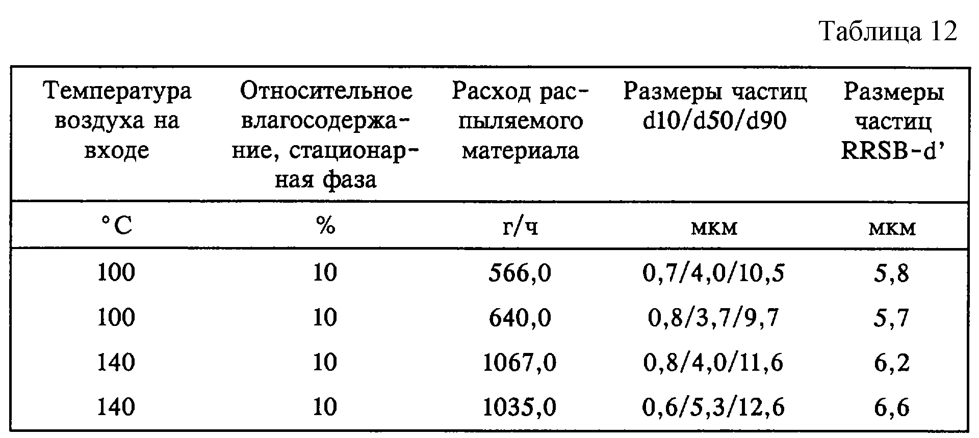 Четыре смеси сушили распылением при трех различных температурах воздуха на входе, а именно: 100, 140 и 180 С. Очень важным параметром распылительной сушки является относительное влагосодержание в стационарной фазе, подвергаемой распылительной сушке. Стационарную фазу рассматривают как секцию сушки, в которой процесс сушки распыляемых частиц завершается и распыляемые частицы испытывают максимальную температурную нагрузку. Относительное влагосодержание в стационарной фазе определяет влагосодержание продукта после сушки. Выбираемое в этих обстоятельствах относительное влагосодержание зависит от состава композиции. Относительное влагосодержание в стационарной фазе для всех четырех смесей выбирают в соответствии с изобретением с тем, чтобы оно было очень низким, составляя менее 40% (конкретно в данном случае приблизительно 10%). Это позволяет установить, является ли распылительная сушка смесей 1-4 все еще действительно возможной. В условиях, указанных выше, распылительная сушка четырех смесей может быть удовлетворительной. Во всех случаях тонкодисперсный порошок распыляемого материала с включением (РВ) получают с достижением хорошего выхода (>90%). На конусе башни и в трубопроводах отложения не образуются, причем возможна удовлетворительная выгрузка продукта несмотря на низкое соотношение пыль/воздух (<< 50 г/Нм3 при стандартных температуре и давлении), (См. табл. 9, 10).