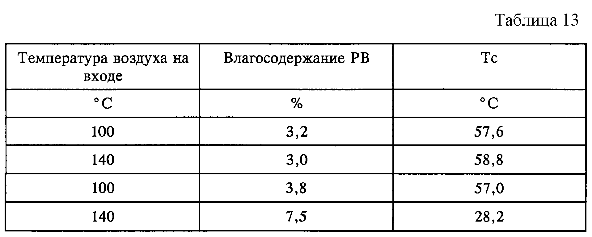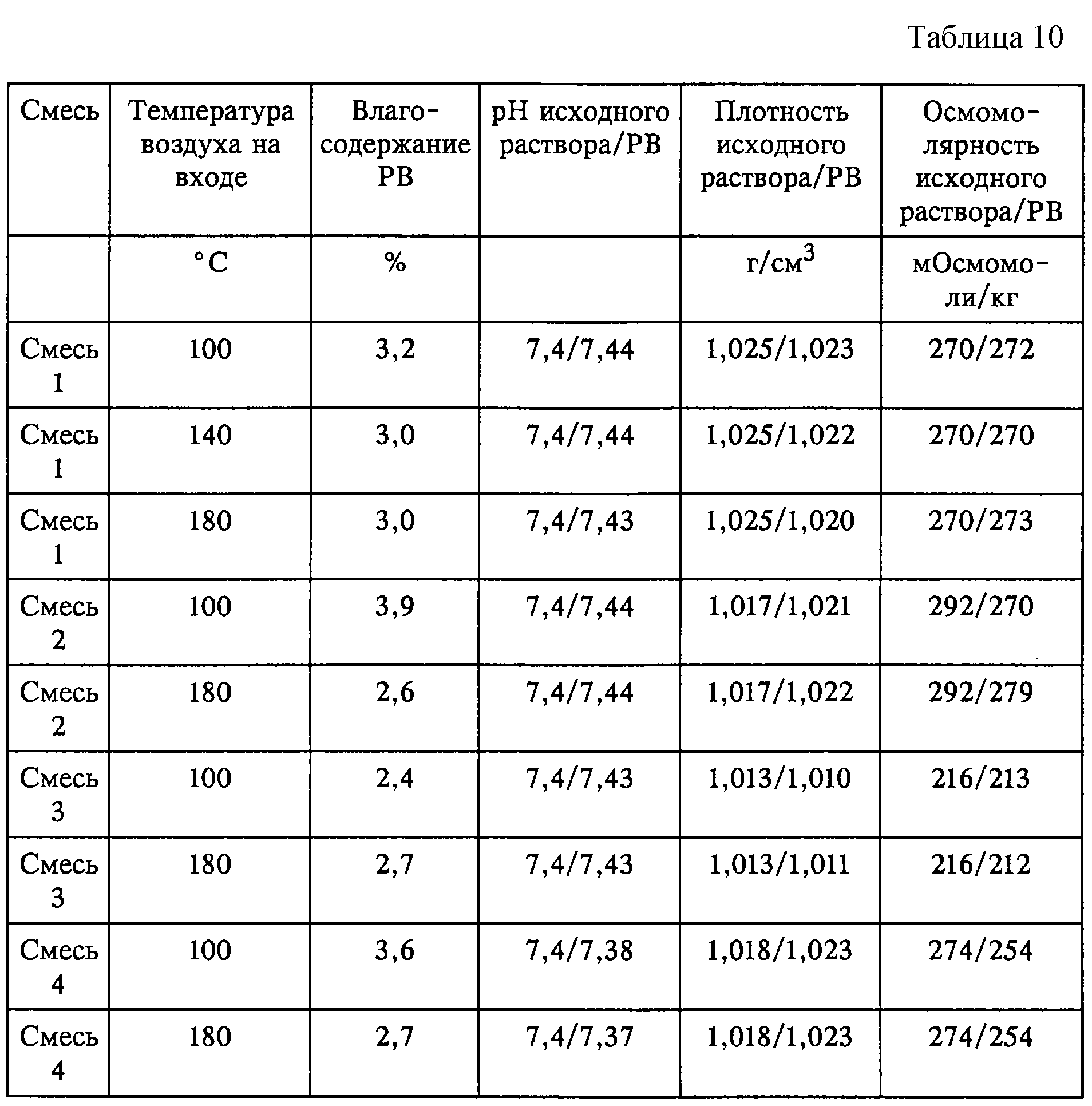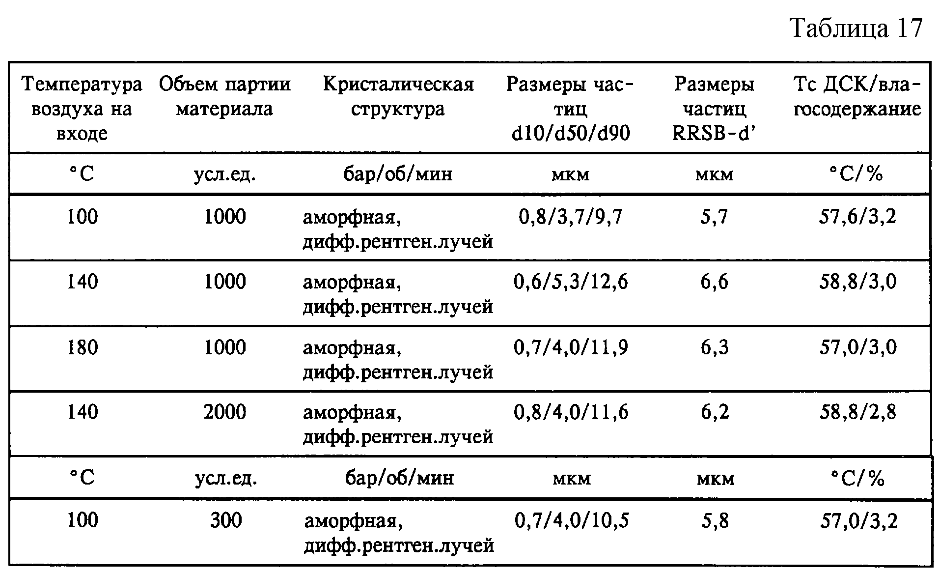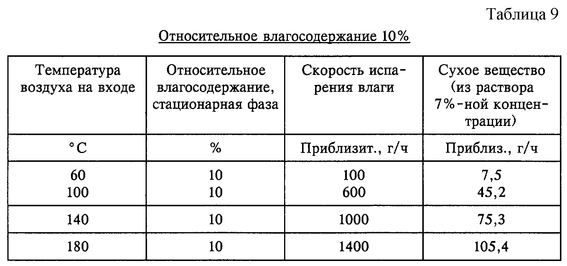Четыре смеси сушили распылением при трех различных температурах воздуха на входе, а именно: 100, 140 и 180 С. Очень важным параметром распылительной сушки является относительное влагосодержание в стационарной фазе, подвергаемой распылительной сушке. Стационарную фазу рассматривают как секцию сушки, в которой процесс сушки распыляемых частиц завершается и распыляемые частицы испытывают максимальную температурную нагрузку. Относительное влагосодержание в стационарной фазе определяет влагосодержание продукта после сушки. Выбираемое в этих обстоятельствах относительное влагосодержание зависит от состава композиции. Относительное влагосодержание в стационарной фазе для всех четырех смесей выбирают в соответствии с изобретением с тем, чтобы оно было очень низким, составляя менее 40% (конкретно в данном случае приблизительно 10%). Это позволяет установить, является ли распылительная сушка смесей 1-4 все еще действительно возможной. В условиях, указанных выше, распылительная сушка четырех смесей может быть удовлетворительной. Во всех случаях тонкодисперсный порошок распыляемого материала с включением (РВ) получают с достижением хорошего выхода (>90%). На конусе башни и в трубопроводах отложения не образуются, причем возможна удовлетворительная выгрузка продукта несмотря на низкое соотношение пыль/воздух (<< 50 г/Нм3 при стандартных температуре и давлении), (См. табл. 9, 10).
