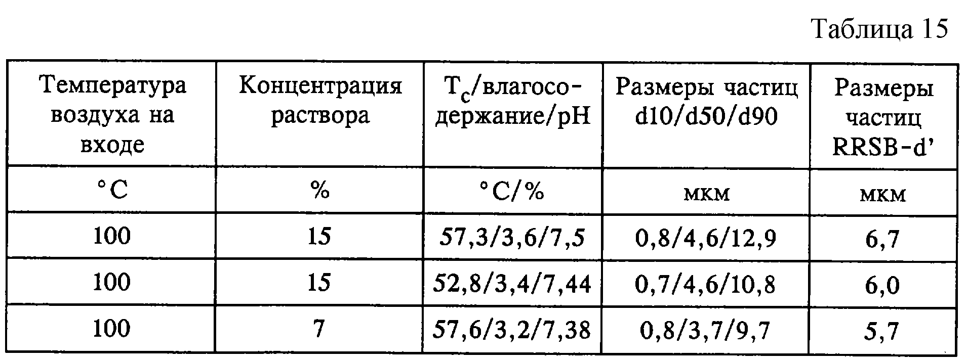 В принципе повышение начальной концентрации раствора возможно до пределов растворимости, определяемых вспомогательными веществами, и приводит к достижению почти тех же самых физических свойств продуктов распыления материалов с включениями, что и в случае раствора 7%-ной концентрации. Это иллюстрируют данные таблицы 15, полученные с использованием смеси 1.