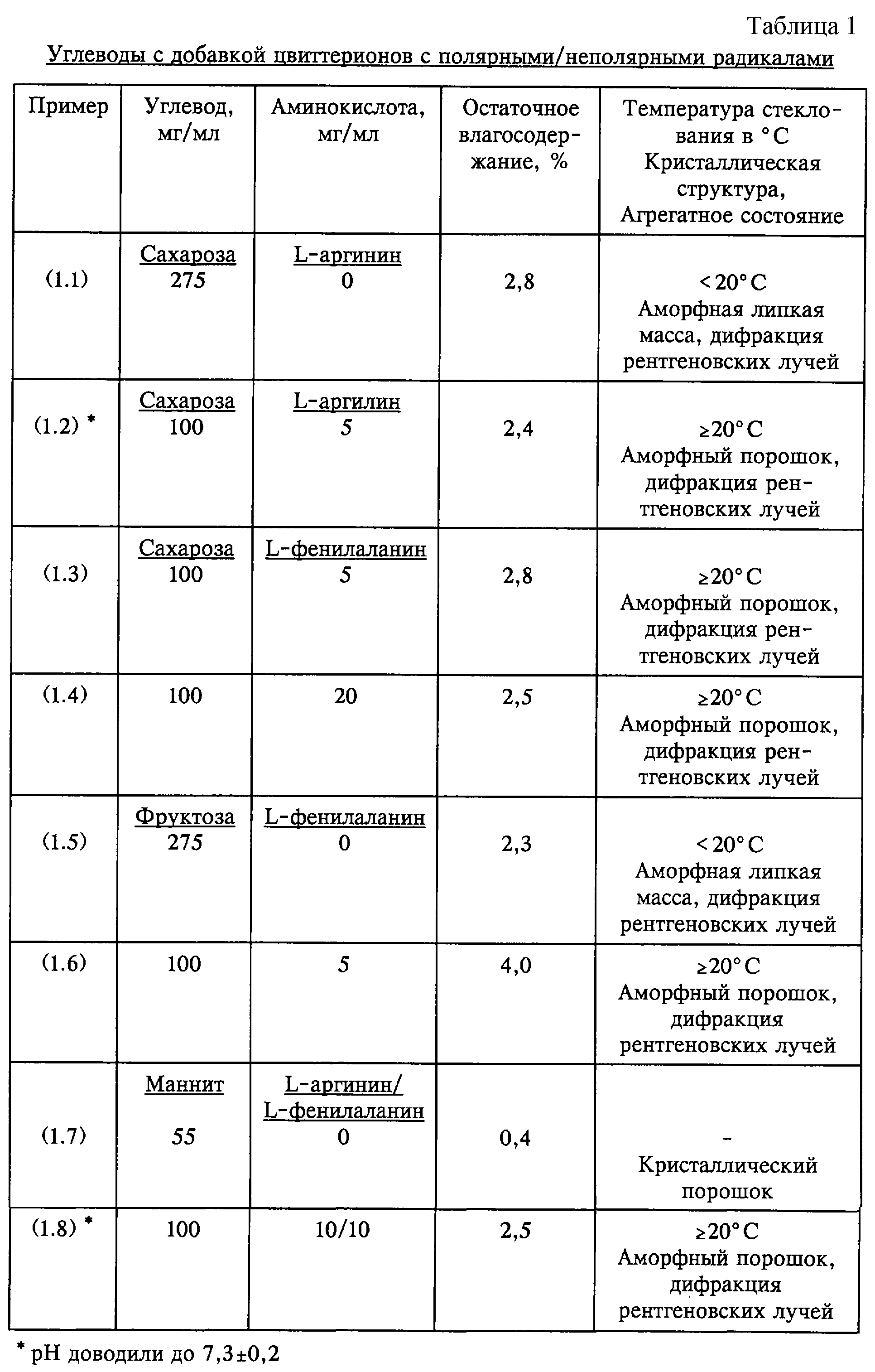 Из данных следующей таблицы очевидно, что, например, сахарозу и фруктозу высушить с достижением экономически хороших результатов невозможно из-за низкой температуры стеклования (1.1 и 1.5), тогда как в процессе сушки растворов с добавками АК получают тонкодисперсные сухие порошки с достижением хорошего выхода (1.2-1.4 и 1.6). Из данных этой таблицы очевидно также, что углеводы, такие как, например, маннит, которые после сушки обычно не образуют аморфных структур и позволяют добиться экономически благоприятных результатов (1.7), при добавлении цвиттерионов или их производных образуют аморфную структуру и позволяют добиться хороших результатов, являясь необходимыми для стабилизации биологических компонентов (1.8). (См табл.1).