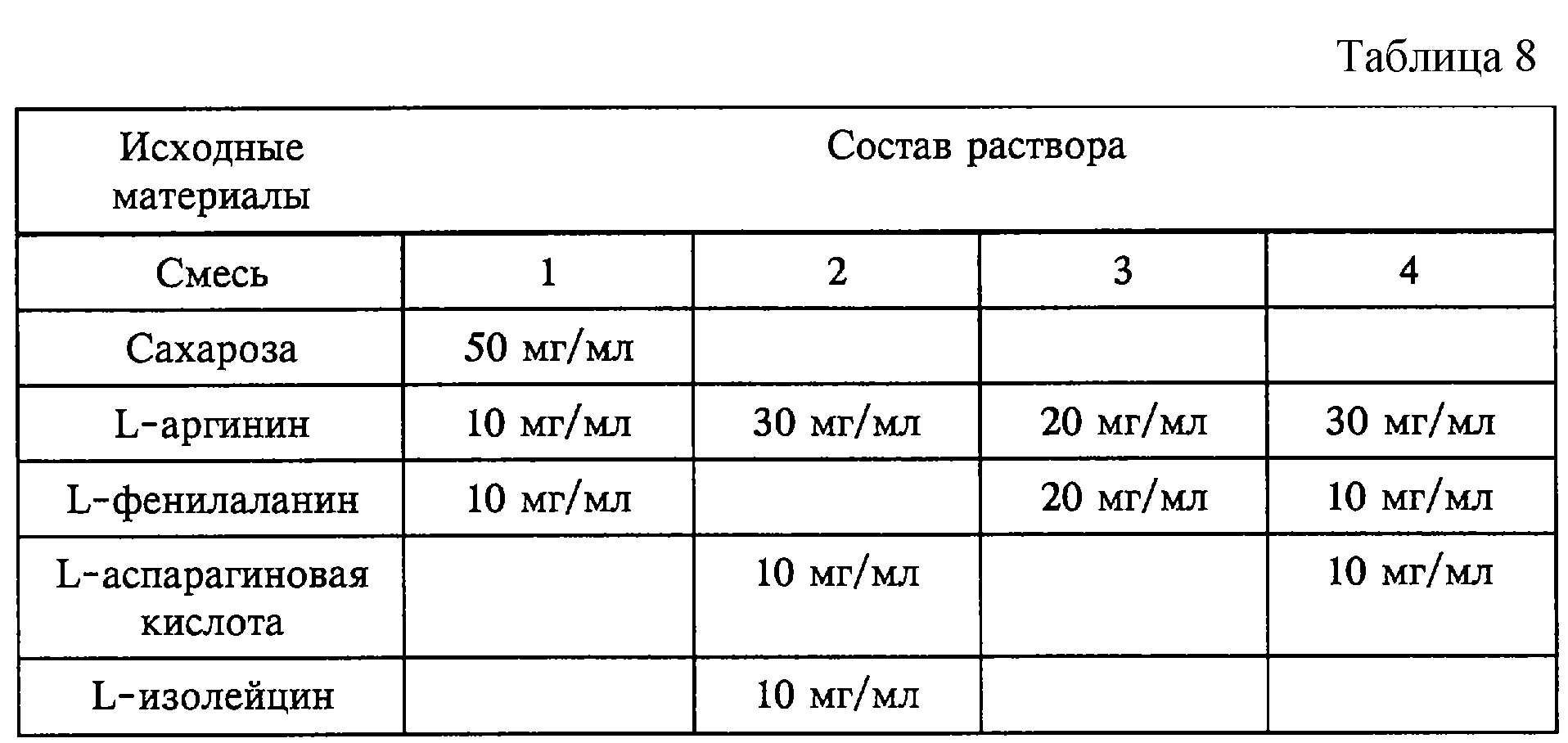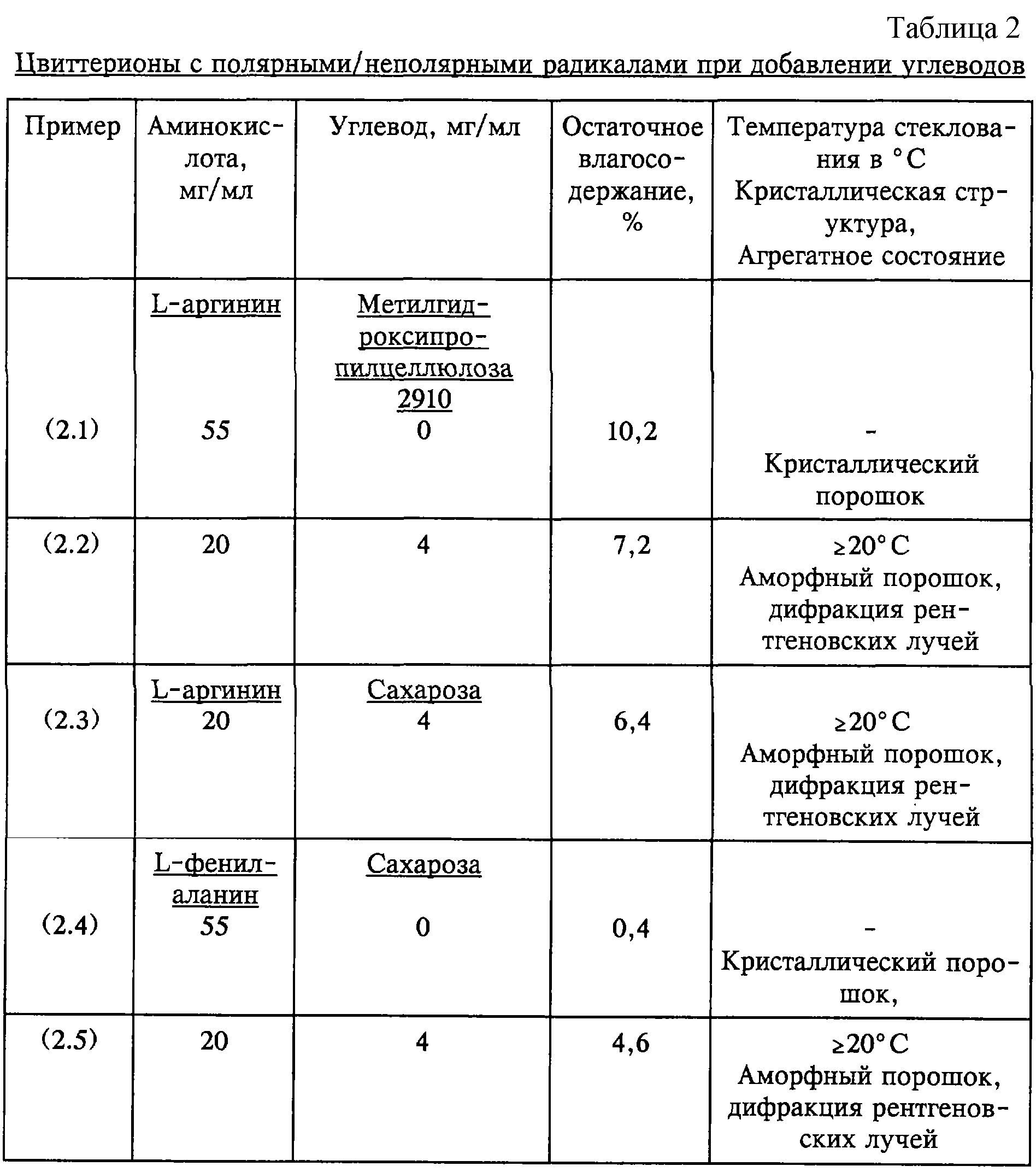 При комнатной температуре в воде растворяют аминокислоту и углевод и раствор сушат распылением. Из данных следующей таблицы очевидно, что в результате использования чистой АК образуется кристаллическая структура (2.1 и 2.4), а при добавлении углевода образуется аморфная структура (2.2, 2.3 и 2.5) (См. табл. 2).