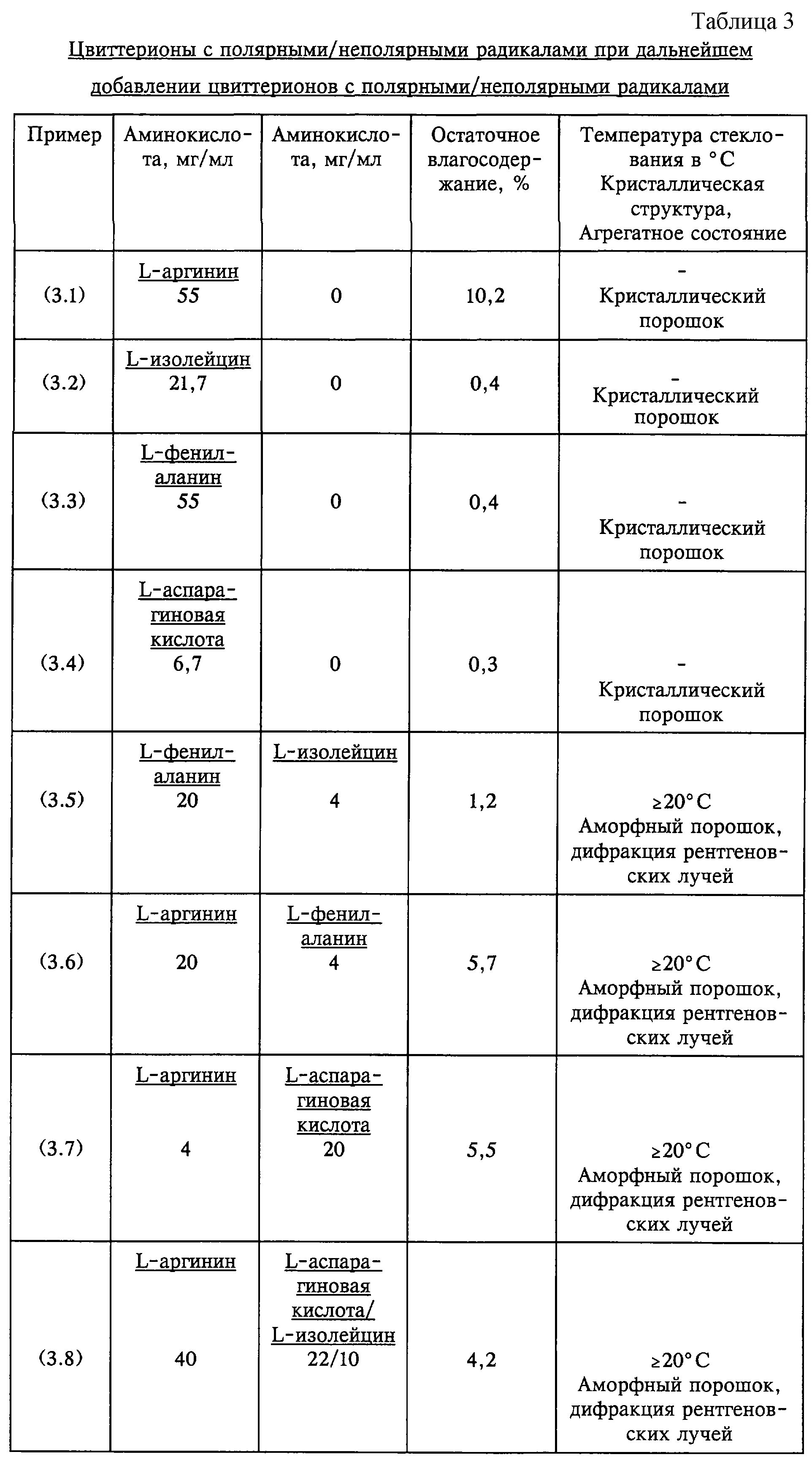 При комнатной температуре в воде растворяют аминокислоты и раствор сушат распылением. Из данных таблицы очевидно, что в результате использования чистой АК образуется кристаллическая структура (3.1-3.4), а при добавлении второй АК образуется аморфная структура (3.5-3.8). В примерах 3.9-3.11 указаны значения ТС для вакуумной сушки. Значения ТС при вакуумной сушке в случае сопоставимых составов определенно ниже значений, достигаемых при осуществлении способа в соответствии с изобретением. (См. табл.3).