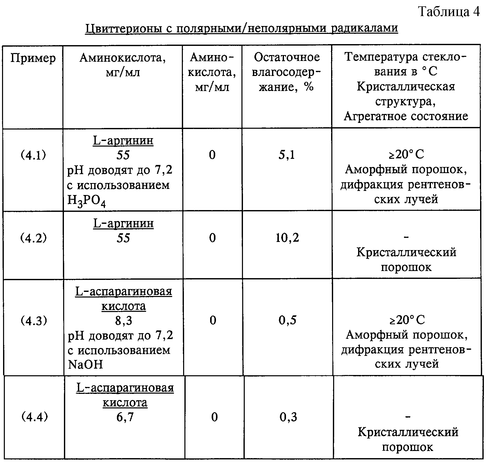 Далее было установлено, что один или несколько цвиттерионов с полярными или неполярными радикалами или их производными, которые, хотя их и можно высушить распылением, не получают в аморфной форме, можно перевести в аморфное состояние путем особого регулирования рН раствора или суспензии перед конвекционной сушкой, предпочтительно доведением рН до 7,0-7,5. Особое регулирование рН раствора перед распылительной сушкой может также оказаться целесообразным в тех случаях (варианты а и б), когда, хотя аморфные структуры и образуются, стабильность белка в аморфной структуре необходимо повысить дополнительно или дополнительно усилить аморфную структуру распыленных продуктов. Такое регулирование рН может также быть необходимым по физиологическим причинам.