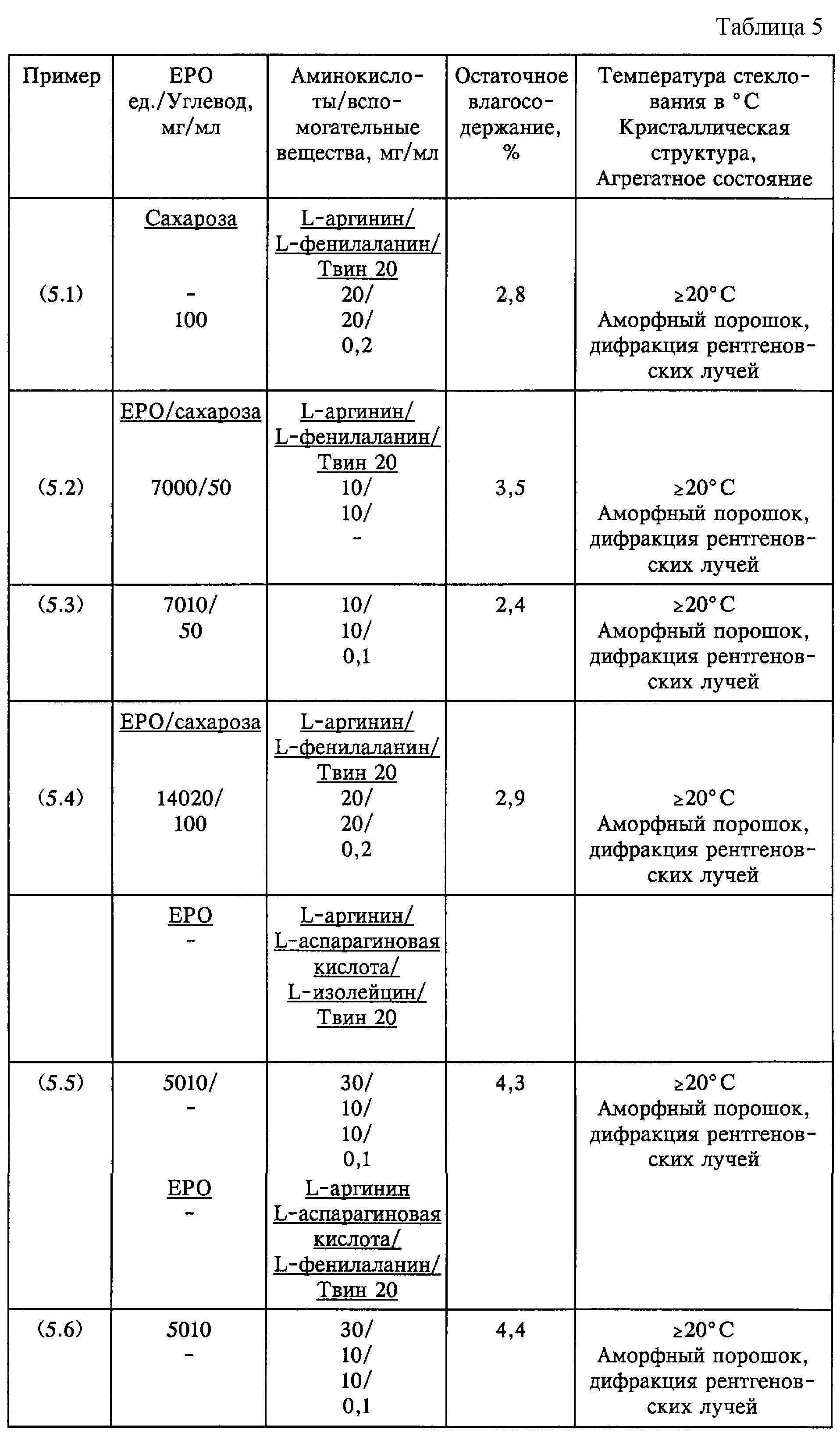 При комнатной температуре в воде растворяют углевод, АК и другие вспомогательные вещества, рН доводят до 7,3 0,2 и раствор сушат распылением. В следующей таблице оптимизированные составы с действующим лекарственным средством, приготовленные согласно способу, предлагаемому в соответствии с изобретением (5.2-5.6). Для сравнения использовали состав плацебо (5.1). Результаты демонстрируют отсутствие продуктов разложения после сушки при любом из составов, причем можно определить наличие высокомолекулярных (ВМ) агрегатов и димеров ЕРО, количества которых в композициях 5.2-5.6 не превышает 0,2%. Это значение не превышается даже после выдержки в течение 3 месяцев (как это проиллюстрировано данными примера 5.3).