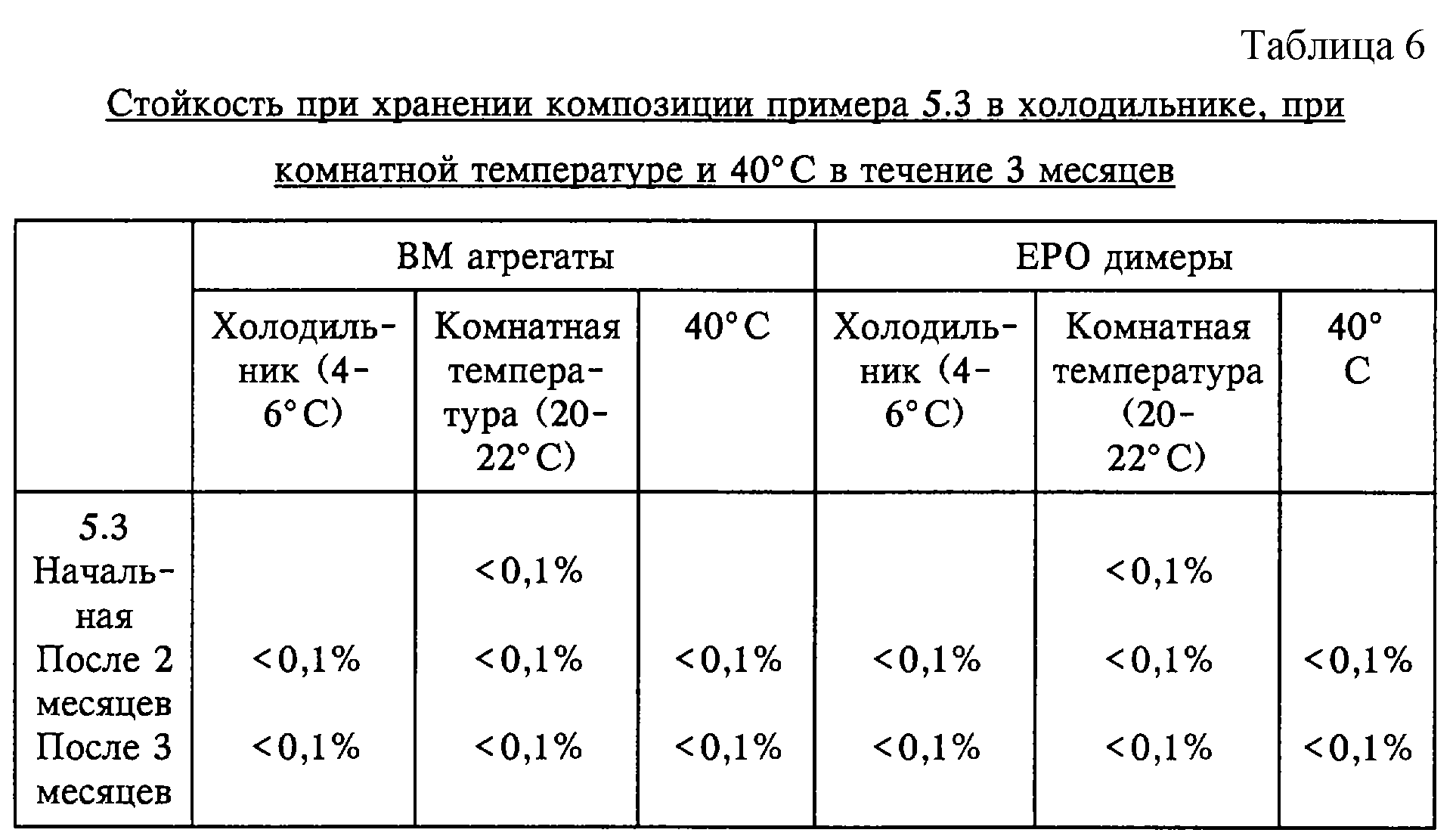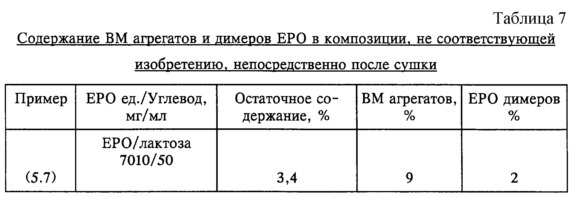 В противоположность этому состав, не соответствующий настоящему изобретению, демонстрирует очень высокое содержание высокомолекулярных (ВМ) агрегатов и димеров ЕРО даже непосредственно после сушки (5.7). (См. табл. 5, 6, 7).