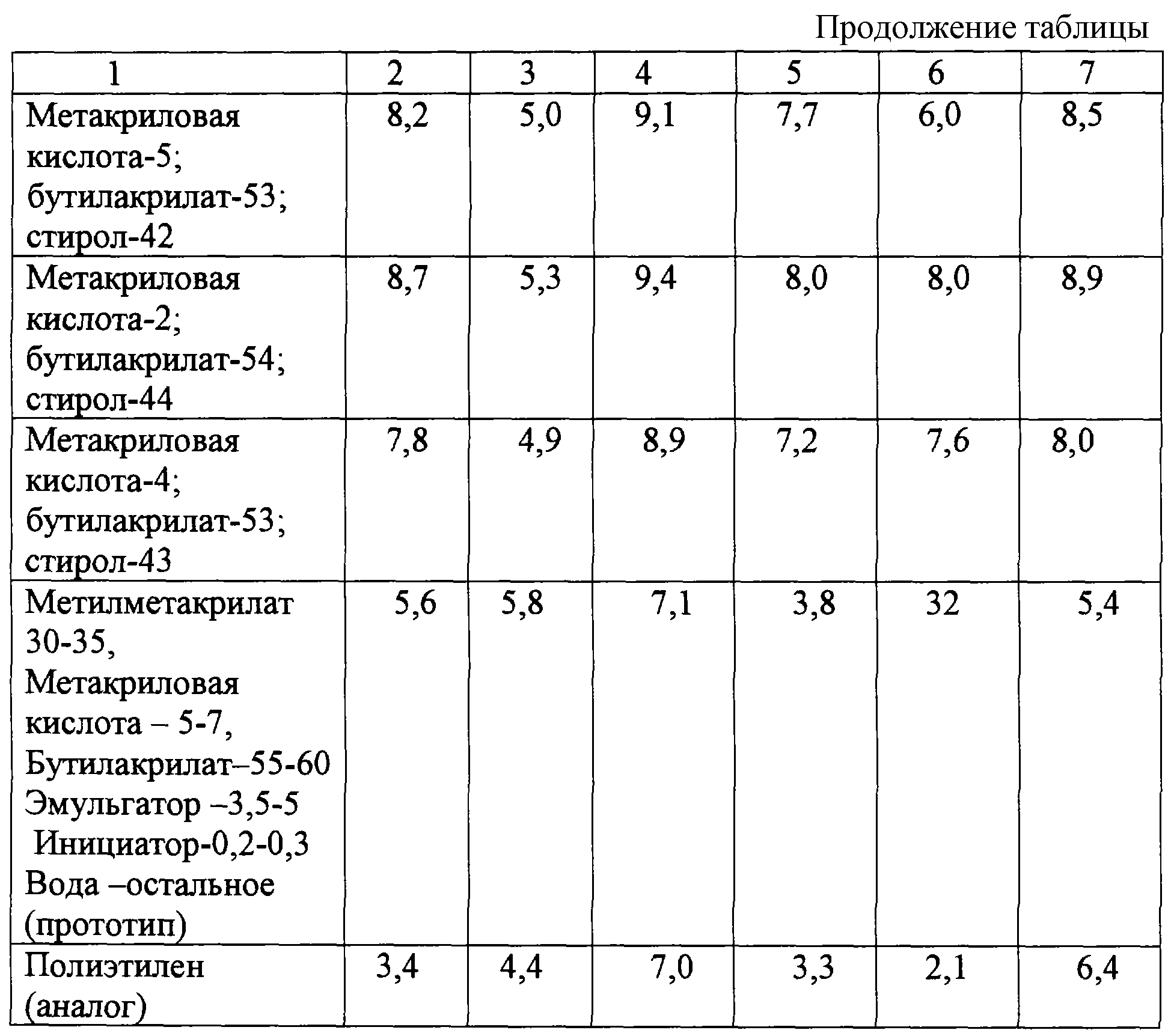Как видно из таблицы, разработанный прокладочный материал для легкой одежды с клеевым полимерным покрытием порошком сополимера акрилового соединения АК 622 (ТУ 6-02-00209912-64-02) характеризуется высокой адгезией к текстильным материалам и в 3-4 раза превышает прочность при расслаивании прокладочных материалов на основе акриловых эмульсий (прототип). При этом прокладочный материал характеризуется высокой устойчивостью к мокрым обработкам, снижение прочности при расслаивании клеевых соединений после 5 стирок не превышает 1-2%, у прототипа снижение прочности составляет 32%. Прокладочный материал обладает оптимальной жесткостью, необходимой для легкого ассортимента одежды, и не превышает 5 сН. Снижение жесткости после 5 стирок не превышает допустимых отклонений (20%).