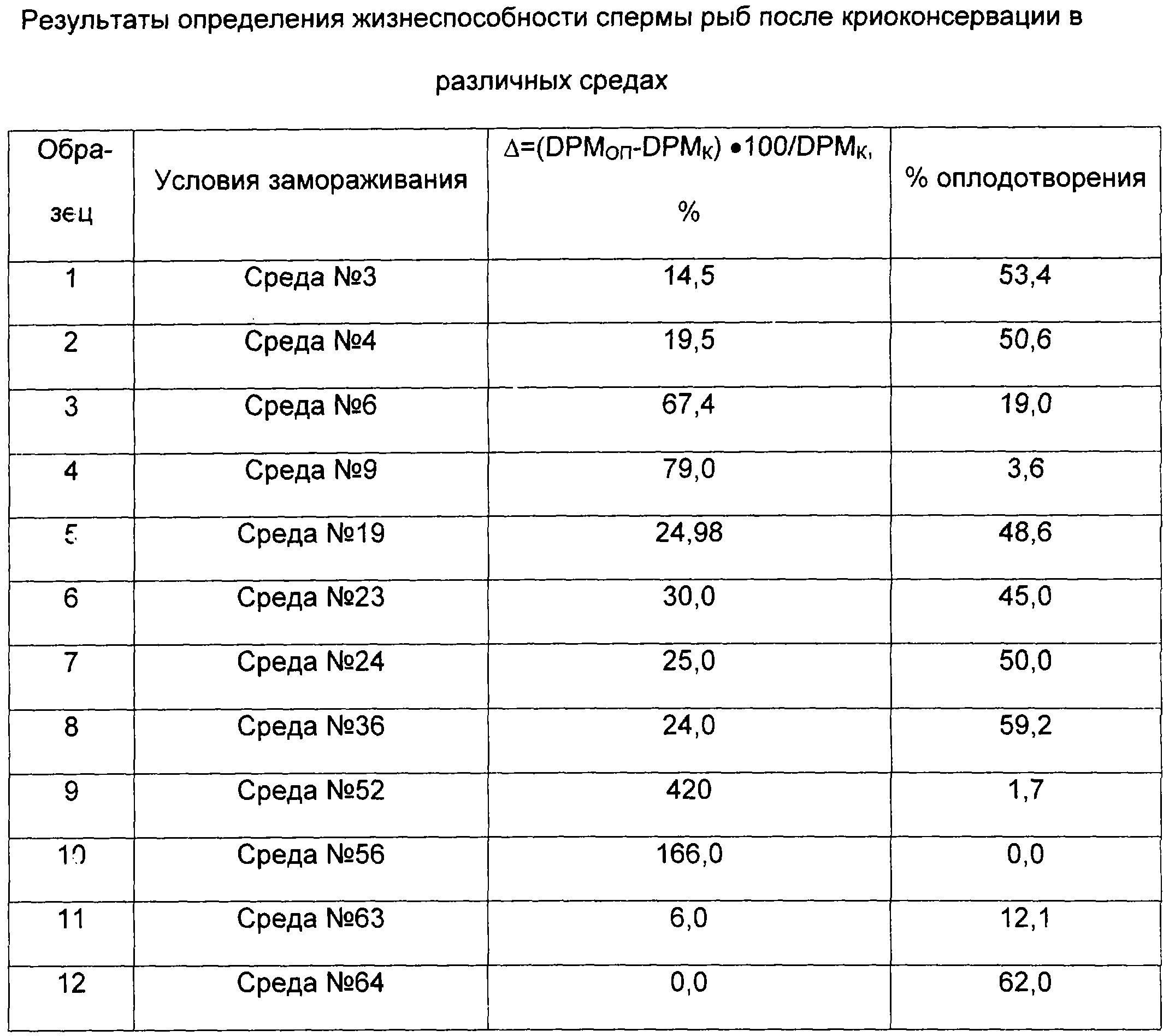 Формула изобретения 1. Способ определения жизнеспособности спермы рыб после криоконсервации, предусматривающий оценку степени повреждения мембран и определение ее жизнеспособности по результатам этой оценки, отличающийся тем, что образцы спермы до и после криоконсервации подвергают воздействию радиоактивного индикатора свободнорадикальных реакций с последующим измерением радиоактивности образцов методом жидкостной сцинтилляции, оценку степени повреждения мембран проводят по изменению уровня содержания в них меченых свободных радикалов по уравнению =(DPМОП–DРМК) 100/DРМК,