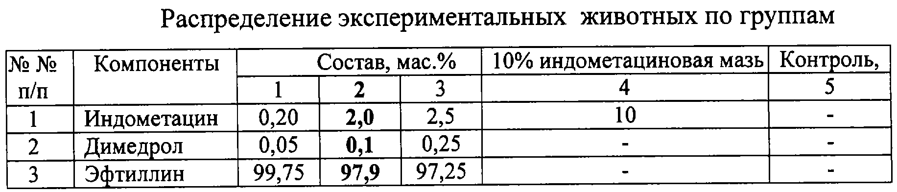 (57) Реферат: Изобретение относится к фармацевтике, и касается противовоспалительного средства для наружного применения. Может применяться для лечения заболеваний суставов воспалительного характера. Изобретение заключается в том, что мазь содержит индометацин, эфтиллин и димедрол при определенном соотношении компонентов. Изобретение обеспечивает повышение лечебного эффекта при снижении числа вероятных осложнений. 1 табл. Изобретение относится к медицине, конкретно к противовоспалительным средствам для наружного применения. Средство может быть использовано при физиотерапевтических процедурах и массаже. Известно большое количество препаратов противовоспалительного действия, особого внимания заслуживают нестероидные противовоспалительные средства – НСПВС [Иванова Л.А., Коптяева Е.Ю., 1991; Клюев М.А. и др., 1990; Машковский М.Д., 1993; Насонова В.А., Астапенко М.Г., 1989; Нелюбов М.В. и др., 1998; Орлова Т.В., 1990; Ackerman S.J. et al., 1983]. К сожалению, все они обладают побочными эффектами. Прежде всего, это изъязвления слизистой оболочки желудка и двенадцатиперстной кишки, которые могут сопровождаться кровотечением; повреждение и некроз почек, задержка родов [Дейл М.М., Формен Дж.К; Машковский М.Д., 1993; Adams D.O., Hamilton T.A., 1988]. Существенным моментом является и усугубление тяжести заболеваний при длительном применении НСПВС (например, поражение суставов при ревматоидном артрите) [Клионер И.Л., 1962]. Наиболее близким к патентуемому средству (прототип) является 10% индометациновая мазь. Однако большое содержание индометацина (10%) нередко приводит к вышеизложенным нежелательным эффектам, а также к развитию аллергических и токсических проявлений, к индивидуальной непереносимости. Технической задачей является повышение лечебного эффекта индометациновой мази при снижении числа вероятных осложнений. Технический результат достигается путем добавления в мазь эфтиллина, содержащего 40% эфтидерма, и 0,1% димедрола, при значительном (в пять раз) снижении концентрации индометацина. Технический результат обеспечивается за счет способности эфтидерма проводить активные компоненты мази через кожу и слизистые оболочки, пролонгируя и значительно усиливая их активность, что и позволяет снизить концентрацию индометацина в 5 раз. Для осуществления предложенного технического решения мазь содержит следующие компоненты, мас.%: Индометацин 0,20-2,5 Димедрол 0,05-0,25 Эфтиллин 97,25-99,75 Включение в мазь эфтиллина в сочетании с димедролом в приведенных соотношениях значительно повышает лечебный эффект индометацина, что поволяет в несколько раз уменьшить его концентрацию. Известно, что индометацин, обладая выраженным противовоспалительным и обезболивающим действием, к сожалению, плохо проникает через кожу и слизистые оболочки. Кроме того, его действие продолжается только 3-6 часов. Сущность предложенного технического решения заключается в том, что эфтиллин, присоединяя индометацин и димедрол, не только легко проводит их в ткани, но и продлевает их действие до 20-22 часов. Эфтиллин, являясь антиоксидантом, повышает жизнеспособность клеток, воздействуя на ферментативные системы биологических мембран, что приводит к усилению и пролонгации лечебного эффекта всех компонентов мази. При содержании индометацина в мази менее 0,2% его эффект незначителен, а при содержании индометацина более 