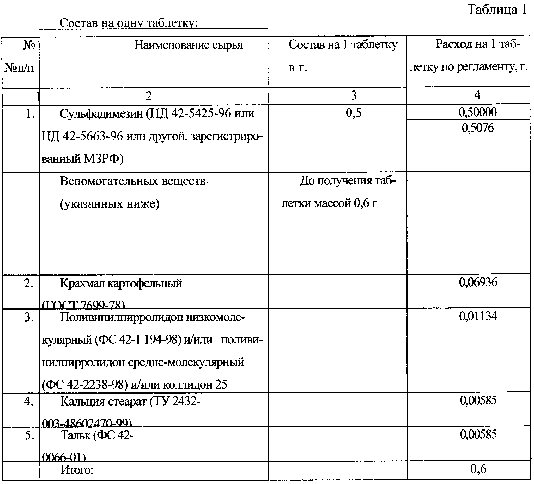 Состав таблеток приведен в таблице 1.
