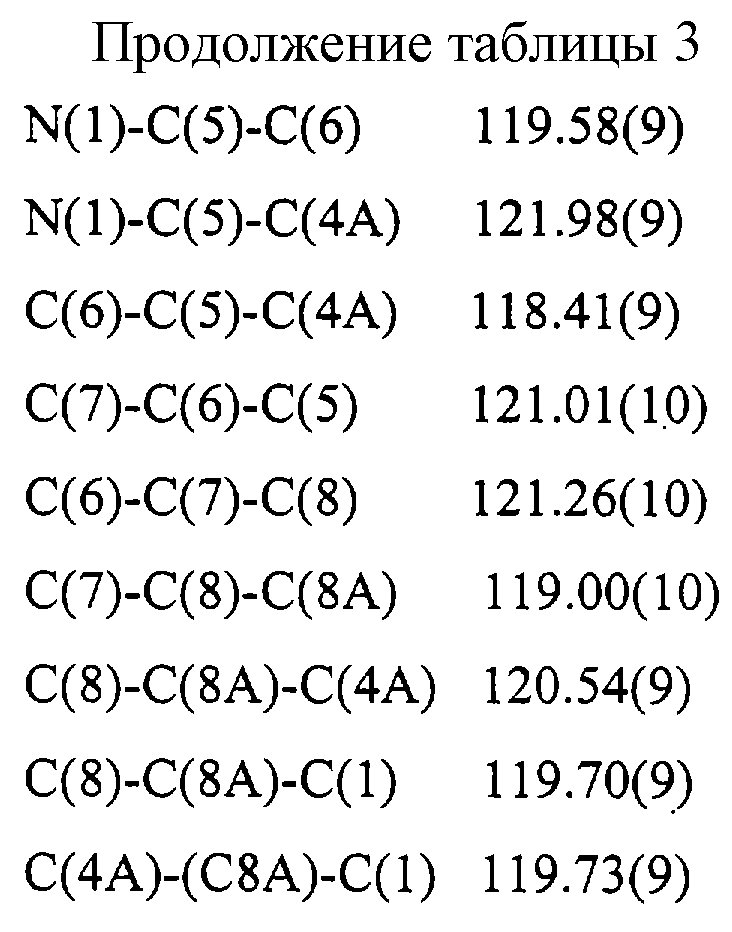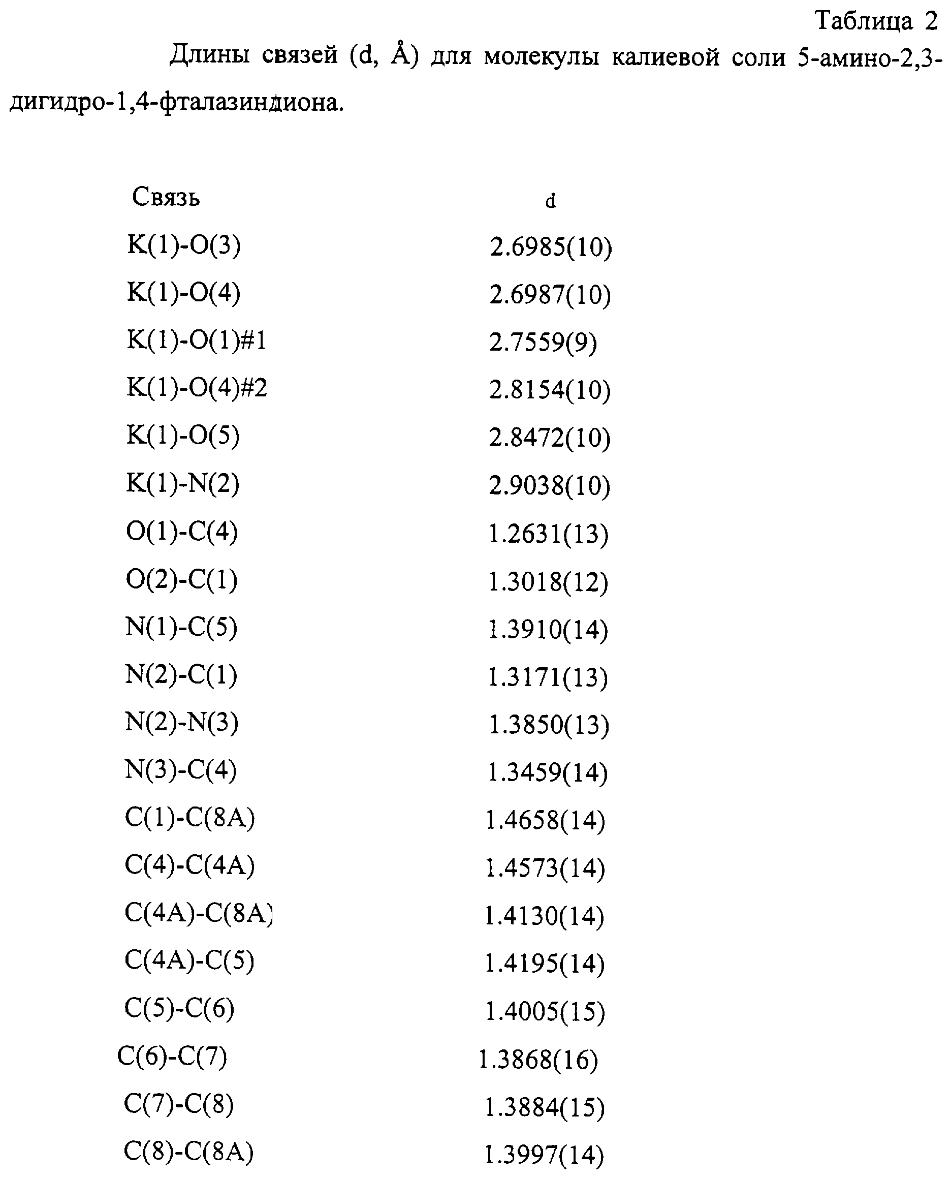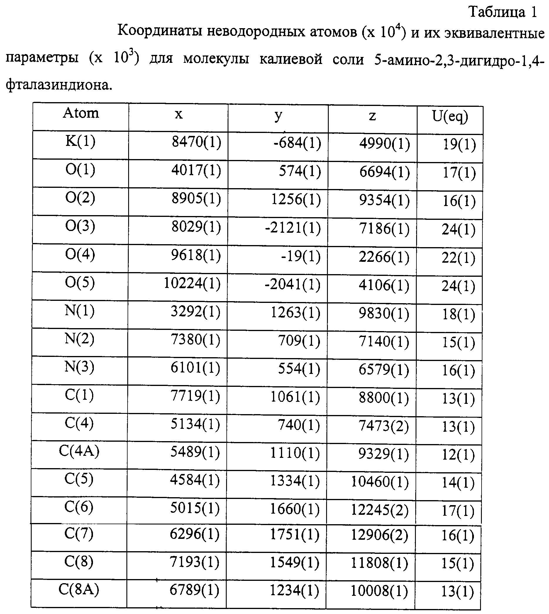 Данные рентгеноструктурного анализа (координаты атомов, длины связей и валентные углы) калиевой соли 5-амино-2,3-дигидро-1,4-фталазиндиона с тремя молекулами кристаллизационной воды приведены в таблицах 1-3, а общий вид молекулы этой соли показан на фиг.4. При этом установлено, что кристаллы калиевой соли 5-амино-2,3-дигидро-1,4-фталазиндиона [C8H6N3О2]–K+·3Н2О (C8H12KN3O5, M=269,31) являются моноклинными, пространственная группа P21/c, при Т=110 К: а=10,7388(10), b=14,2207(19), с=7,3793(15) , =99,594(3) , V=1111,2(3) , Z=4, dc=1,610 мг/см3, F(000)=560, =0,493 мм-1.
