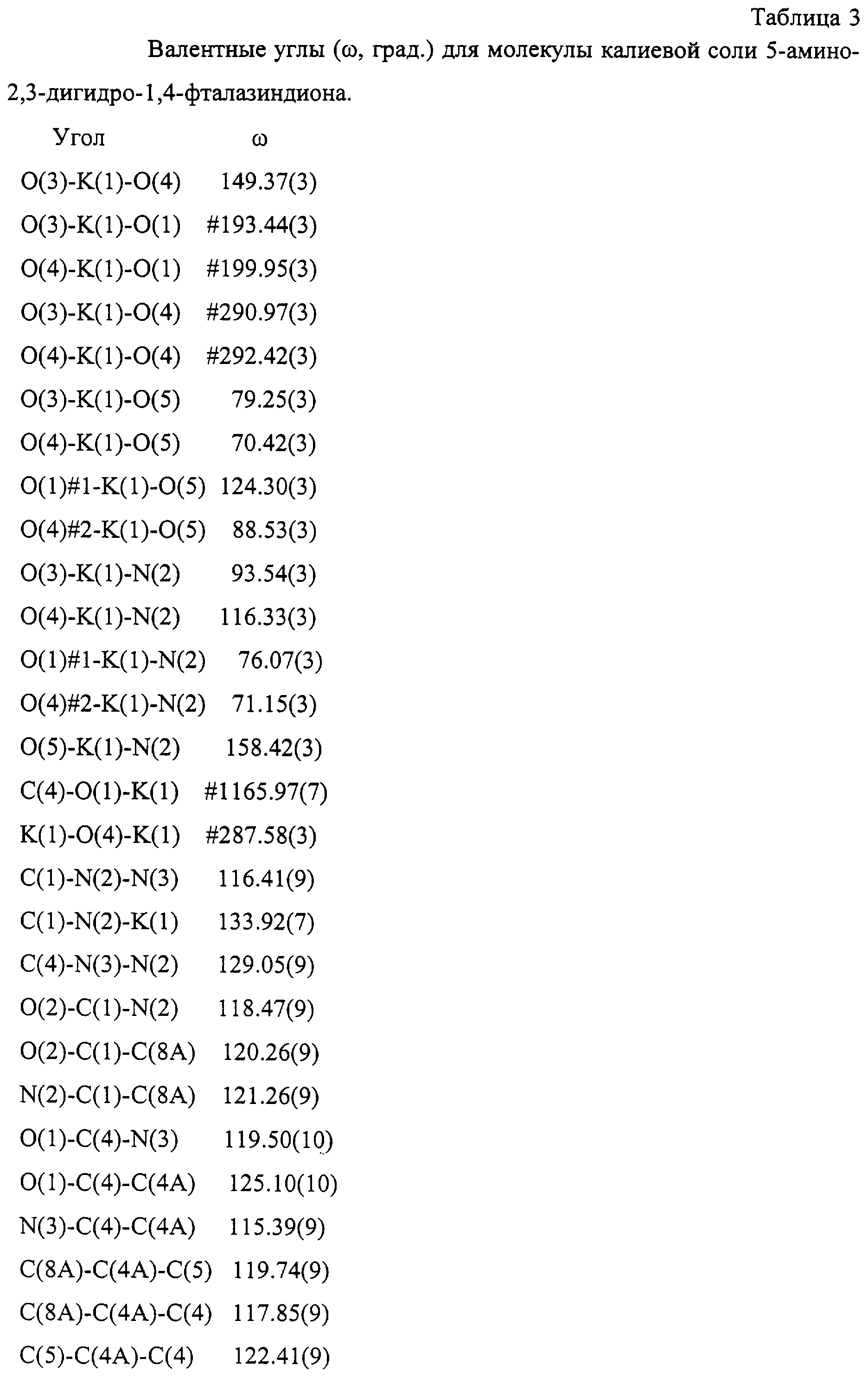 Данные рентгеноструктурного анализа (координаты атомов, длины связей и валентные углы) калиевой соли 5-амино-2,3-дигидро-1,4-фталазиндиона с тремя молекулами кристаллизационной воды приведены в таблицах 1-3, а общий вид молекулы этой соли показан на фиг.4. При этом установлено, что кристаллы калиевой соли 5-амино-2,3-дигидро-1,4-фталазиндиона [C8H6N3О2]–K+·3Н2О (C8H12KN3O5, M=269,31) являются моноклинными, пространственная группа P21/c, при Т=110 К: а=10,7388(10), b=14,2207(19), с=7,3793(15)