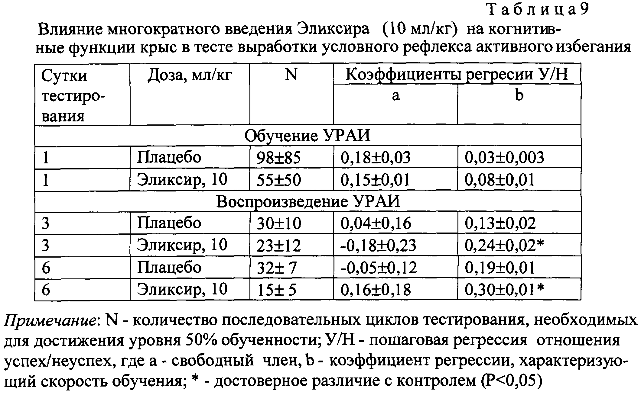 Протекторное действие эликсира в отношении когнитивных функций животных на фоне алкогольной интоксикации оценивали, используя методику выработки условного рефлекса активного избегания (УРАИ) в челночной камере Shuttle. Эликсир вводили крысам на протяжении 5 дней до тестирования перорально в дозе, соответствующей 10 мл/кг нативного эликсира; животным контрольной группы вводили плацебо. Когнитивные функции животных оценивали на фоне продолжающегося ежедневного введения эликсира. Способность крыс к обучению тестировали на 6 сутки от начала введения препарата, а воспроизведение УРАИ осуществляли на 9 и 12 сутки введения (т.е. через 3 и 6 суток после первого обучающего цикла). Затем крысам опытной и контрольной групп интрагастрально вводили этанол (3 мл/кг) и на следующие (13) сутки проводили повторное тестирование способности к воспроизведению УРАИ. Состояние когнитивных функций после амнезирующего действия этанола оценивали по продолжительности латентного периода воспроизведения условного рефлекса, числу сочетаний, необходимому для достижения уровня 50% правильных ответов (N), регрессии отношения числа успешных решений задачи (избегания удара током) к неуспешным.