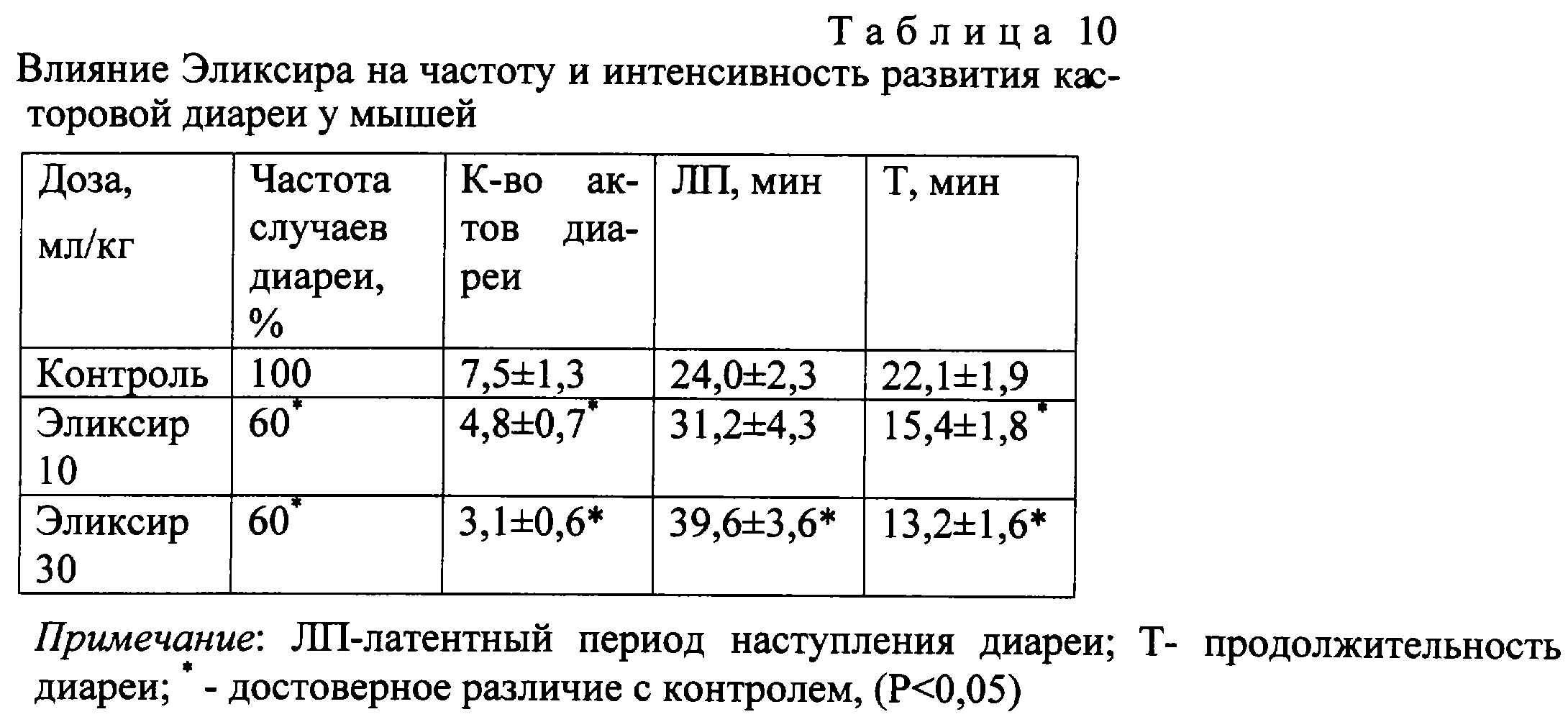 Касторовую диарею вызывали интрагастральным введением мышам 0,3 мл подогретого касторового масла. Плацебо и деалкоголизированный эликсир в дозе, соответствующей 10 и 30 мл/кг нативного препарата, вводили за 30 мин до эксперимента. На протяжении 90 мин учитывали время начала и окончания диареи, а также интенсивность и частоту случаев диареи.