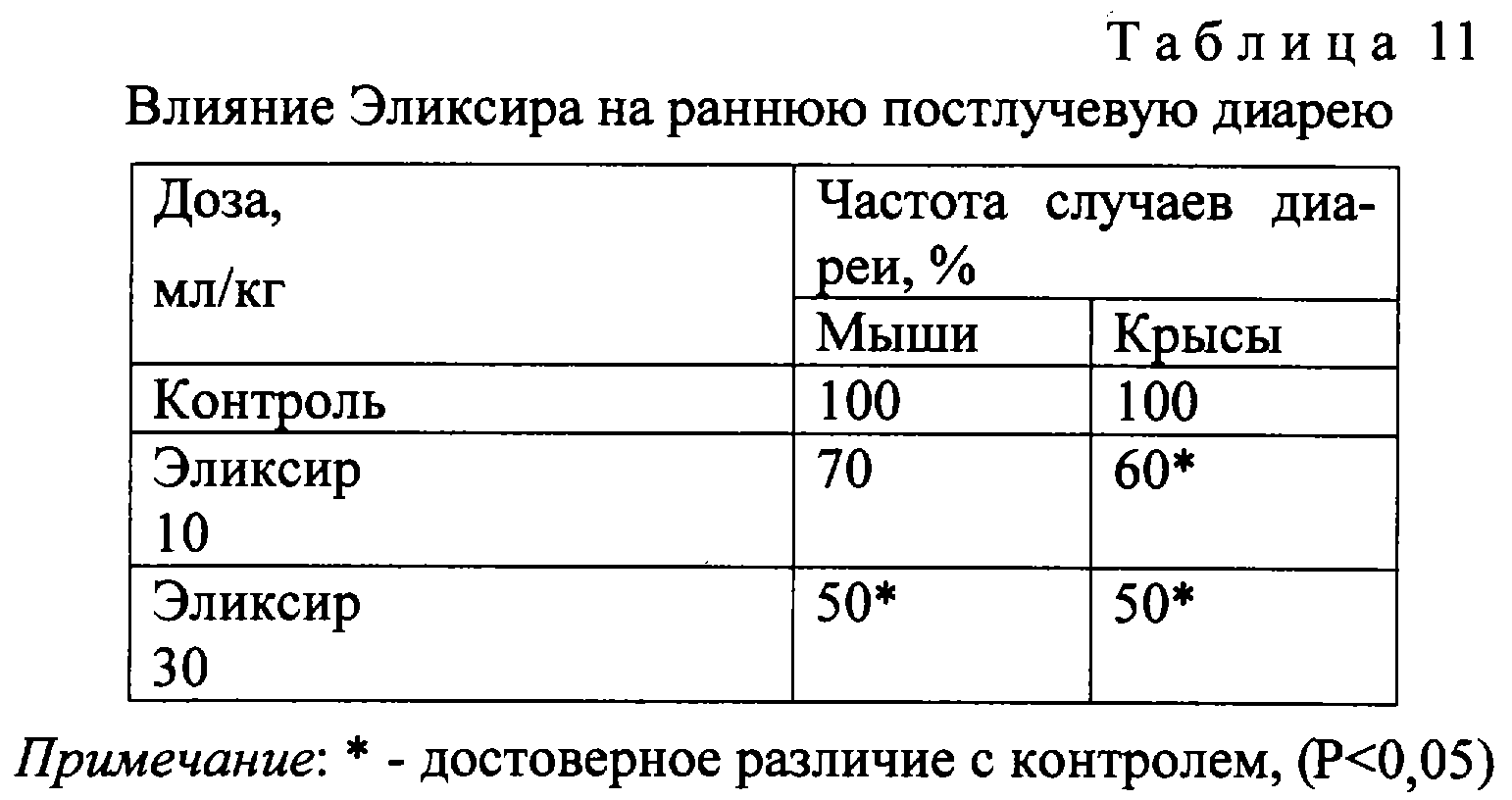 Мышам и крысам за 30 мин до облучения вводили в желудок плацебо или деалкоголизированный эликсир в дозах, соответствующих 10 и 30 мл/кг нативного препарата. Учитывали наличие и интенсивность диареи в течение 2 ч наблюдения. Результаты исследований представлены в табл. 11, из которой следует, что постлучевая диарея развивалась в контроле в 100% случаев. Предварительное введение эликсира в дозах, соответствующих 10 и 30 мл/кг нативного препарата, полностью предотвращает развитие диареи у 30-50% животных (Р<0,05); у остальных животных введение эликсира ослабляет интенсивность диареи, задерживает ее развитие и сокращает продолжительность, уменьшает количество и объем дефекаций.