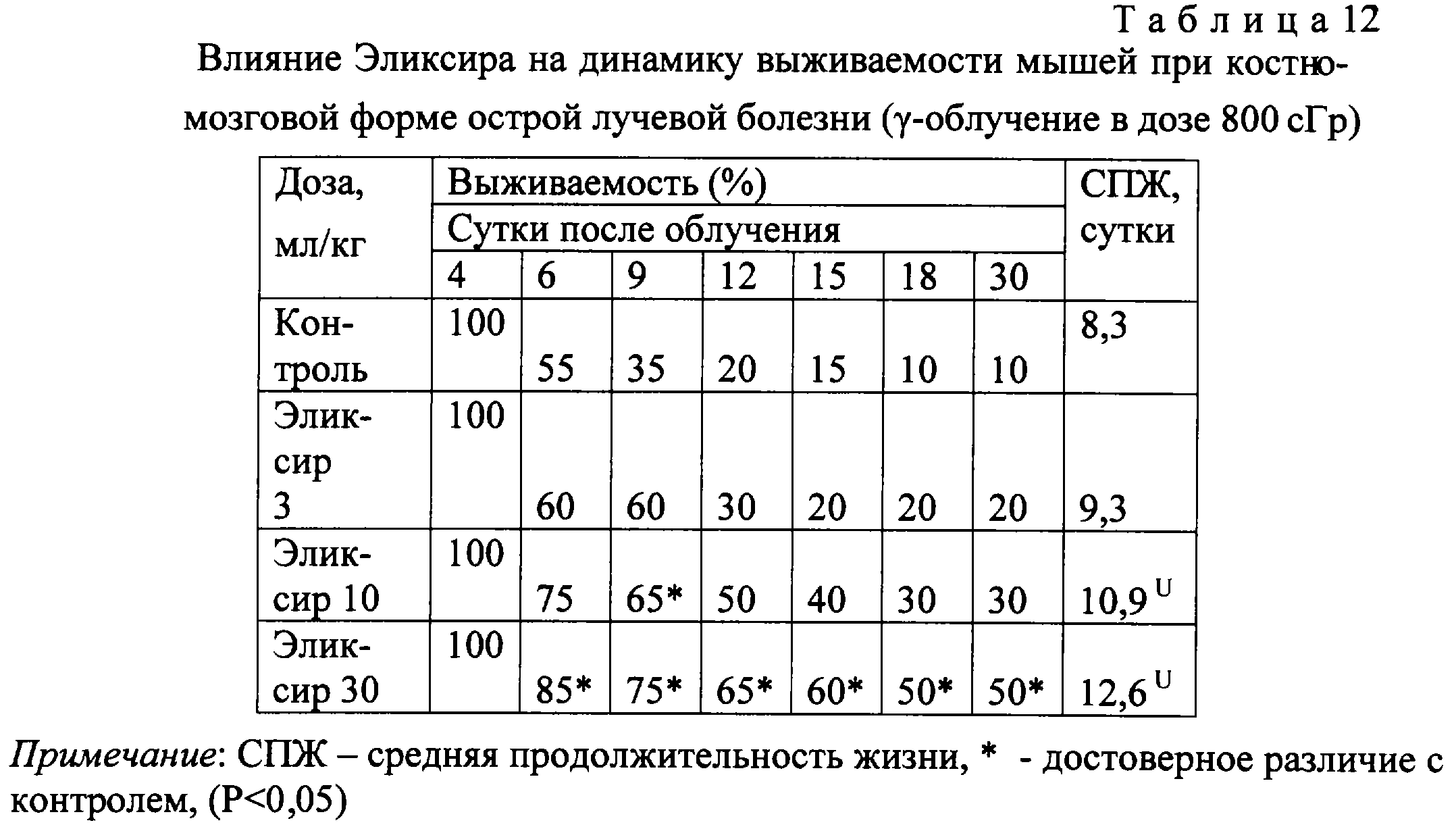 Эффективность эликсира как средства ослабления проявлений лучевого поражения оценивалась в 2 сериях опытов на мышах, подвергнутых -облучению в дозах 800 и 950 сГр при мощности излучения 50 сГр/мин. Использованные дозы радиации моделируют преимущественно костномозговую (800 сГр) и смешанную (костномозговую и желудочно-кишечную – 950 сГр) формы лучевого поражения. Каждая серия экспериментов включала по 5 групп животных: 1 – биологический контроль, 2 – облучение + плацебо, 3, 4, 5 – облучение + деалкоголизированный эликсир в дозах, эквивалентных 3, 10 и 30 мл/кг нативного препарата соответственно. Эликсир и плацебо вводили интрагастрально ежедневно на протяжении 6 суток после облучения. Течение острой лучевой болезни (ОЛБ) контролировали по выживаемости животных на протяжении 30 суток и динамике массы тела при ежедневном взвешивании.