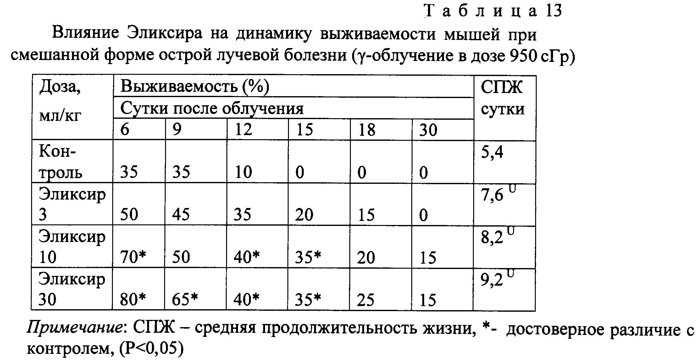 Введение эликсира во всех испытанных дозах оказывает положительное действие на течение ОЛБ, ослабляя падение массы тела животных в период разгара костномозгового синдрома (эффект препарата на декремент массы статистически достоверен (Р<0,05)).