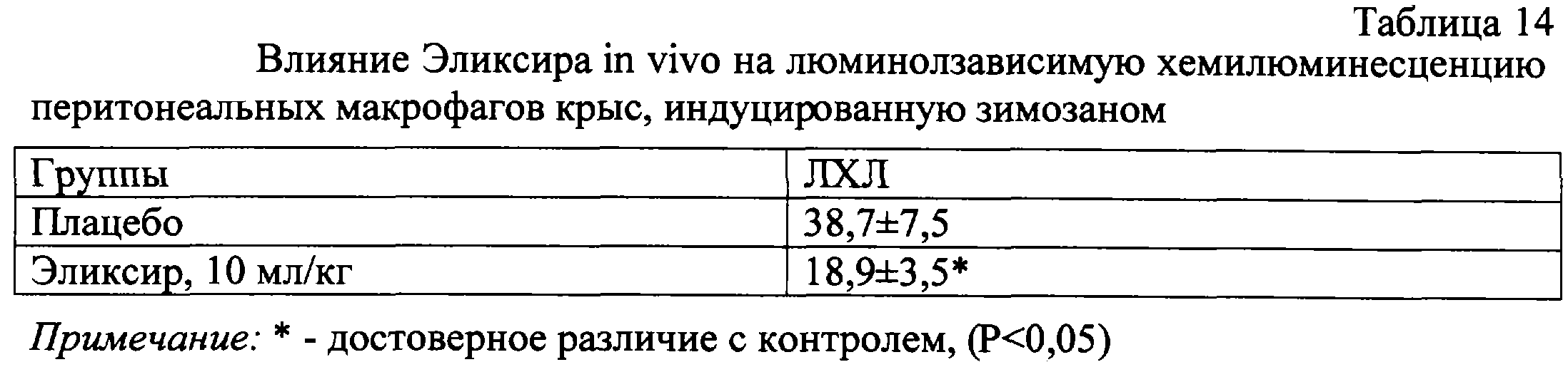 Антиоксидантное действие деалкоголизированного эликсира оценивали по степени угнетения индуцированной зимозаном реакции оксидантного взрыва перитонеальных макрофагов (МФ). Установлено, что макрофаги животных, систематически получавших деалкоголизированный эликсир в дозе, соответствующей 10 мл/кг нативного препарата, отвечают выраженным снижением хемилюминесцентного отклика на стимуляцию, то есть пониженной способностью к генерации АФК (табл. 14). Индекс ингибирования эликсиром оксидантной реакции МФ, рассчитанный как доля декремента люминолзависимой хемилюминесценции (ЛХЛ) в опытной группе по отношению к плацебо, составляет 51,3%.