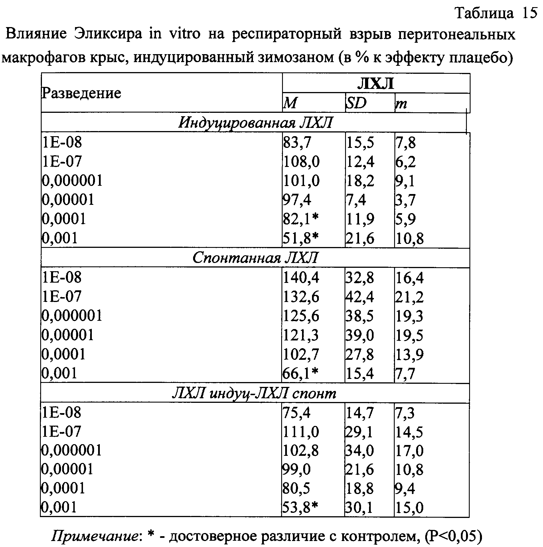 Результаты эксперимента суммированы в табл. 15. Установлено, что деалкоголизированный эликсир в разведении, соответствующем 1 мл/л (1 10-3) нативного препарата, ингибирует генерацию АФК как активированными, так и неактивированными макрофагами (индекс ингибирования по отношению к плацебо составляет в среднем около 50%) (Р<0,05).