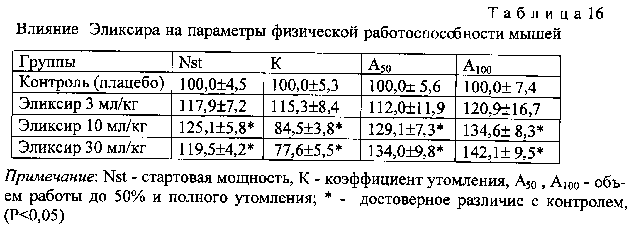 Для оценки способности эликсира препятствовать гиподинамическому эффекту алкогольной интоксикации и восстанавливать физическую выносливость и работоспособность, проведены эксперименты на мышах с использованием модифицированного инструментального теста Киплингера, позволяющего оценить скорость плавания обученных животных при многократном проплыве стандартной дистанции. За 1 сутки до тестирования физической работоспособности животным группы активного контроля вводили перорально этанол в наркотической дозе (3 мл/кг), а животным опытной группы – этанол и деалкоголизированный эликсир в дозе, соответствующей 30 мл/кг нативного препарата.