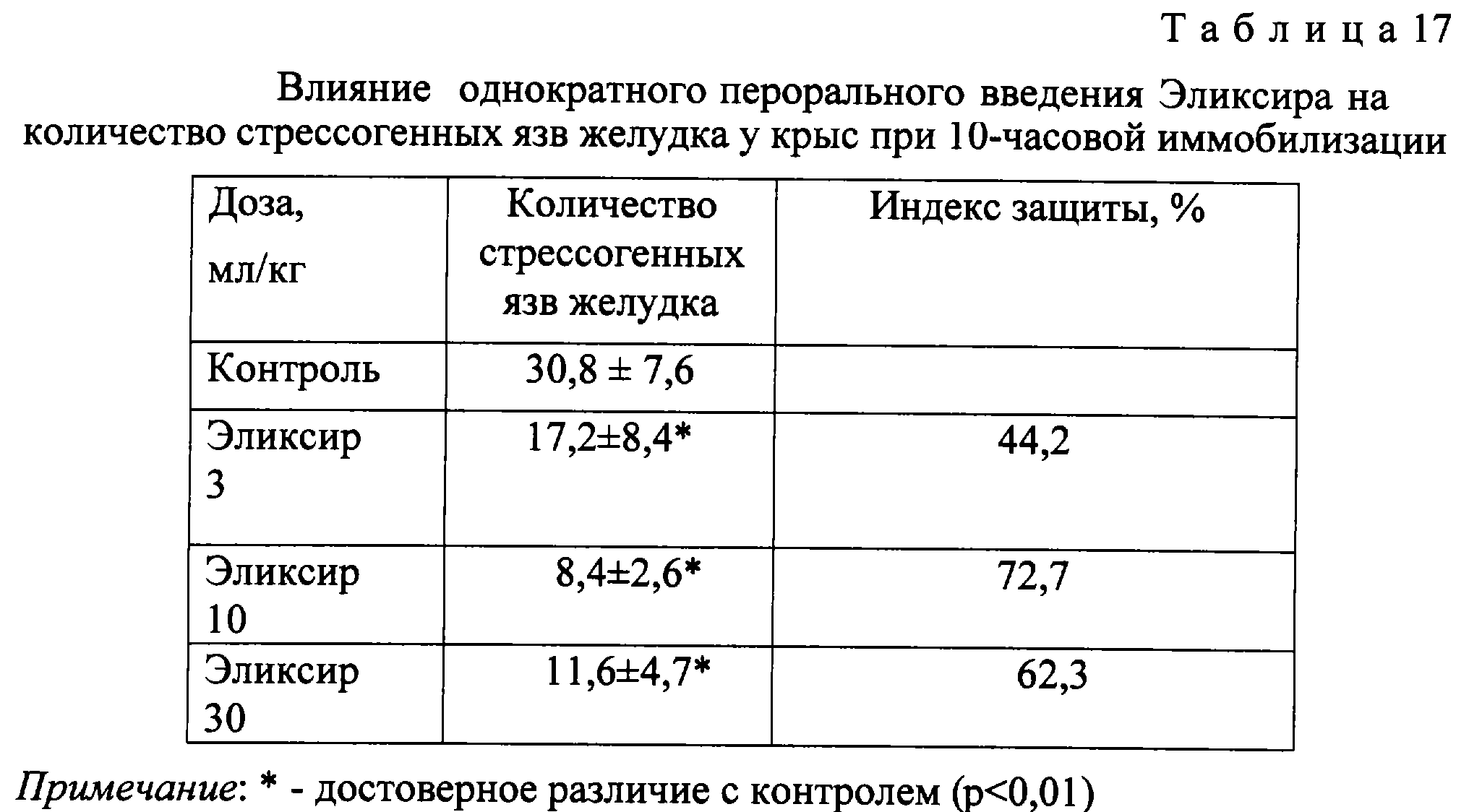 а) При оценке стресспротекторной активности деалкоголизированного эликсира в условиях однократного введения в качестве экспериментальной модели интенсивного стресса использовалась жесткая фиксация крыс на спине в течение 10 ч. Эликсир при однократном пероральном введении за 30 мин до опыта в дозах, соответствующих 3,10 и 30 мл/кг нативного препарата, обладает выраженной адаптогенной активностью, что выражается в значительном уменьшении количества стрессогенных язв желудка у крыс (табл. 17).