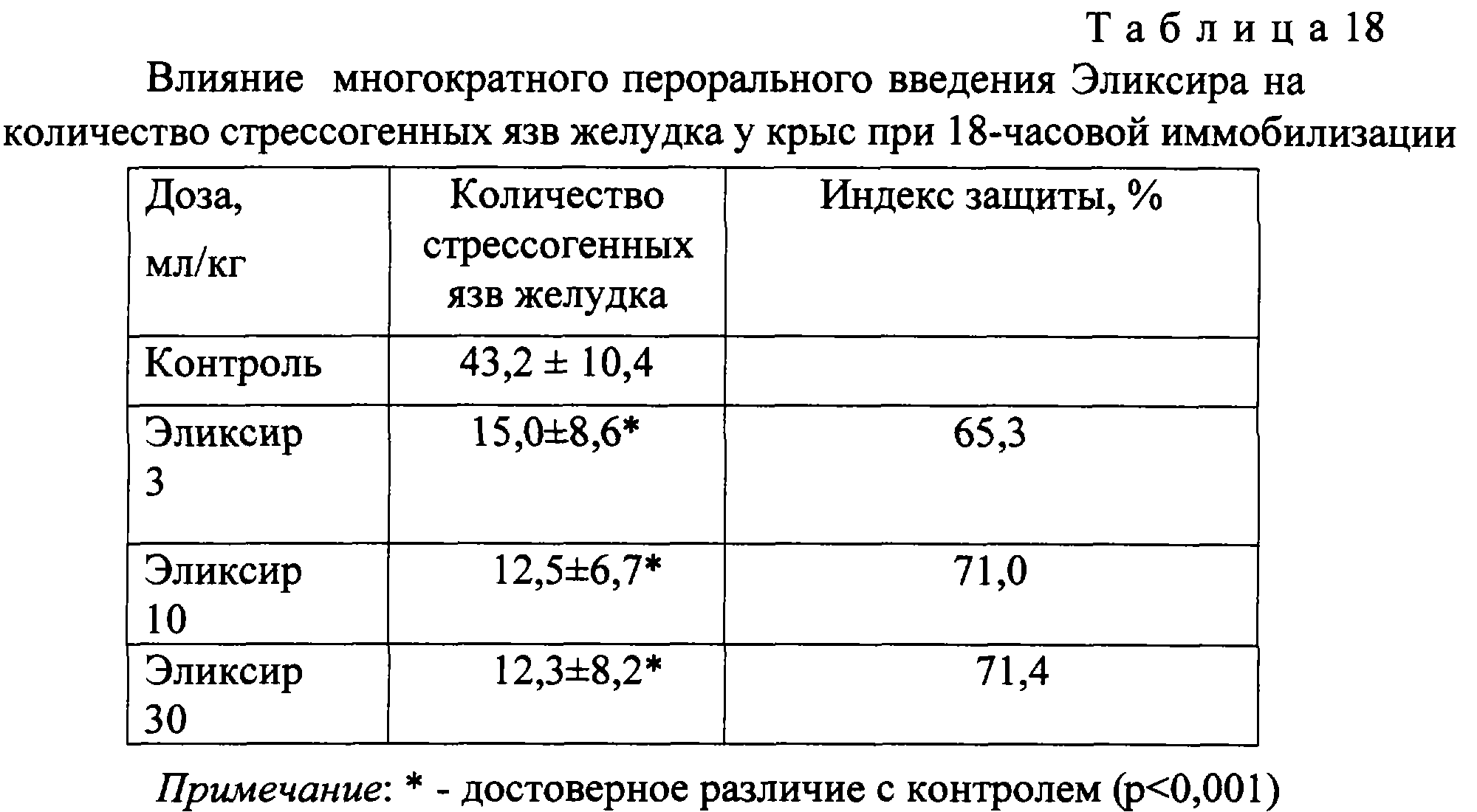 б) Стресспротекторная активность деалкоголизированного эликсира в условиях многократного введения оценивалась на той же экспериментальной модели в условиях жесткой 18-часовой фиксации крыс на спине. Эликсир при предварительном 5-дневном пероральном введении в дозах, соответствующих 3, 10 и 30 мл/кг нативного препарата, значительно ослабляет органные и эндокринные феномены стресса, включая тимико-лимфатическую инволюцию и язвенные поражения слизистой желудка (табл. 18).