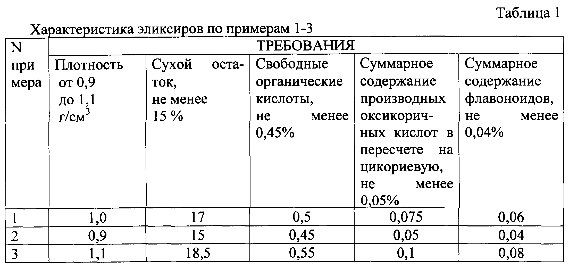 Эликсиры, полученные из композиции по примерам 1, 2, 3, имеют следующие показатели (табл. 1).