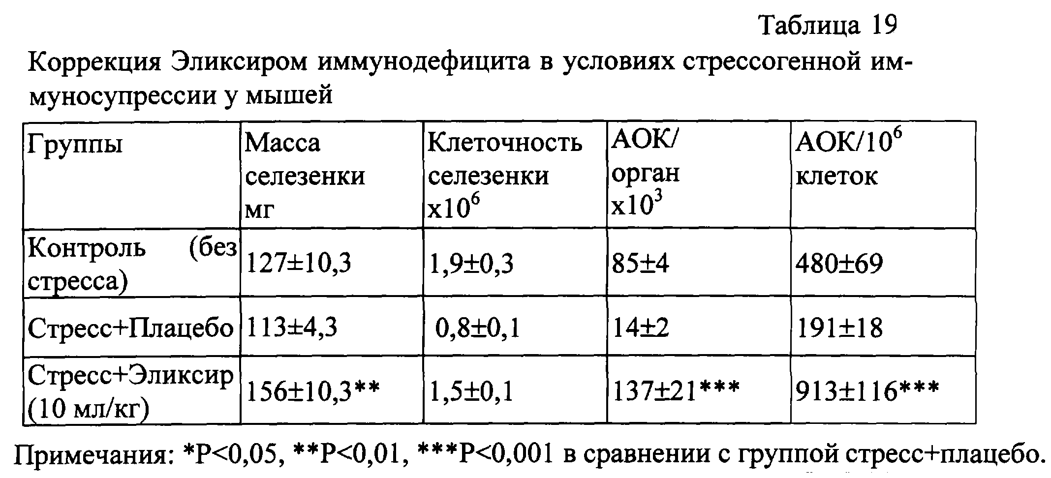 в) Влияние эликсира на фагоцитоз Установлено, что деалкоголизированный эликсир обладает стимулирующим эффектом на фагоцитарную функцию нейтрофилов как в опытах in vitro на клетках донорской крови человека, так и в экспериментах in vivo на мышах. Добавление деалкоголизированного эликсира в широком диапазоне концентраций (0,3-30 мл/л) к пробам крови человека in vitro оказывает стимулирующий эффект на фагоцитарную активность нейтрофилов. Средние значения индекса стимуляции фагоцитоза составляют для эликсира 1,18-1,28 (различия с контролем достоверны, р<0,05).В опытах in vivo деалкоголизированный эликсир, вводимый внутрь мышам на протяжении 6 дней в дозах, соответствующих 3, 10 и 30 мл/кг нативного препарата, вызывает стимуляцию фагоцитарной активности у мышей, повышая долю фагоцитирующих клеток в 2,1-3,4 раза (различия с контролем достоверны, р<0,05-0,01). г) Корректорный эффект эликсира при стрессогенном иммунодефиците Установлено, что деалкоголизированный эликсир обладает иммунокорректорным действием в условиях стрессогенной иммуносупрессии. Исследование иммунокорректорной активности эликсира проводили на модели стрессогенного иммунодефицита, индуцированного у мышей 2-кратным плаванием продолжительностью 60 мин, осуществляемым через 30 мин и 24 ч после иммунизации животных внутрибрюшинно субоптимальной дозой эритроцитов барана. Иммунный ответ оценивали по количеству антителообразующих клеток (АОК) в селезенке, которое определяли по методу Каннингема на 5-й день после иммунизации. Деалкоголизированный эликсир вводили ежедневно на протяжении 4 дней в дозе, соответствующей 10 мл/кг нативного препарата. Результаты эксперимента представлены в табл. 19.