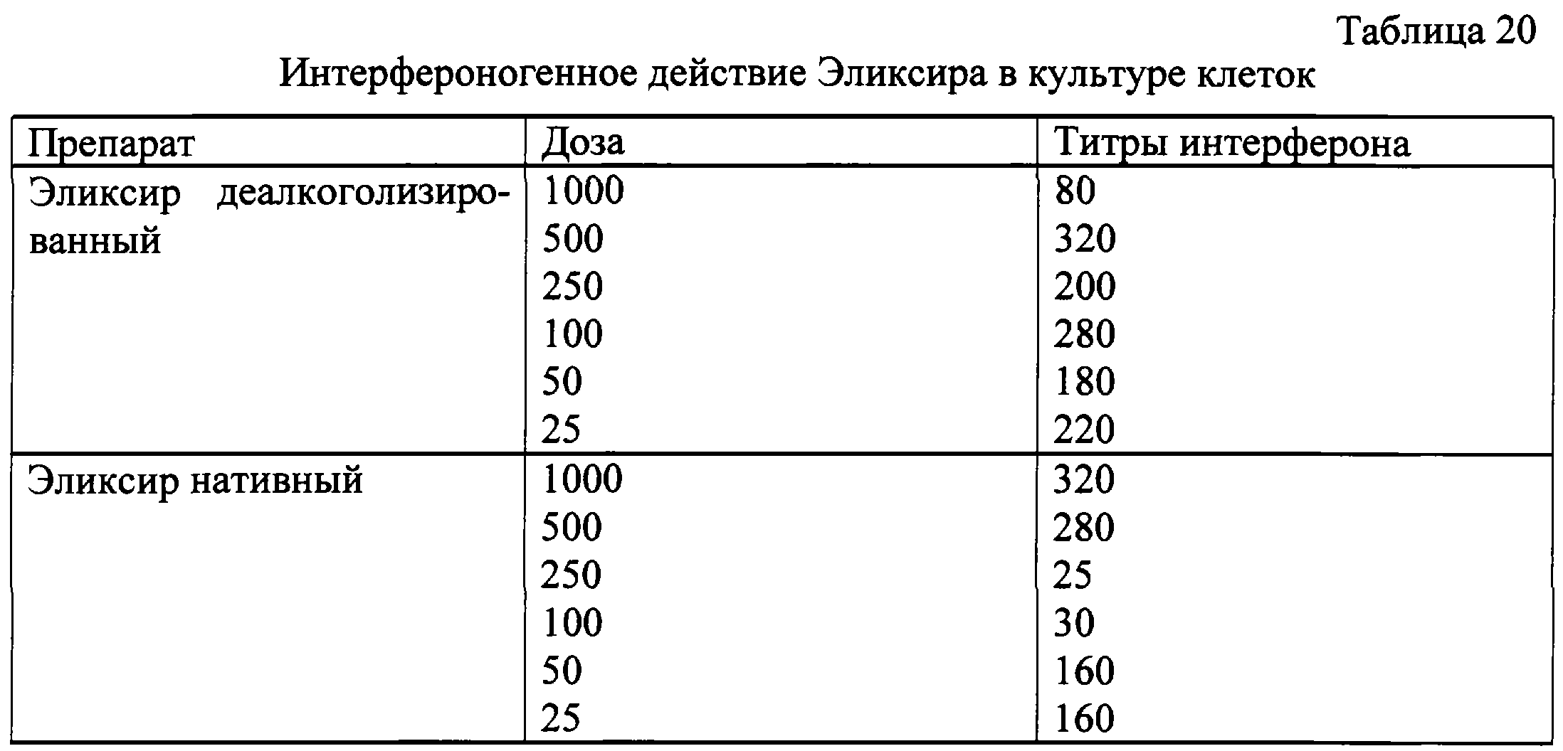 Установлено, что как нативный, так и деалкоголизированный эликсир являются высокоактивными индукторами интерферона. Результаты исследования представлены в табл. 20.